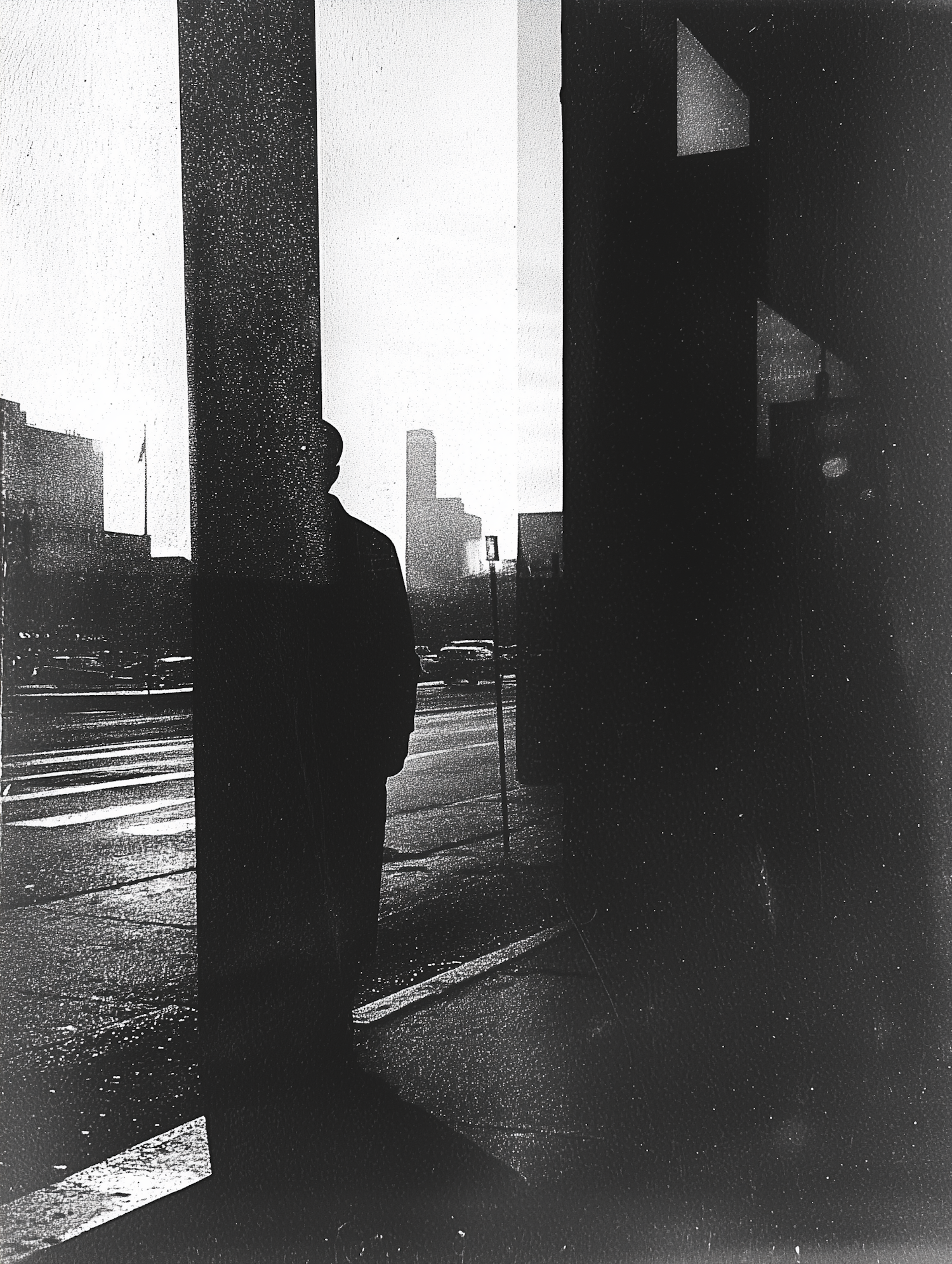 Mysterious black and white urban scene with a silhouette, cityscape, and striking light contrasts.