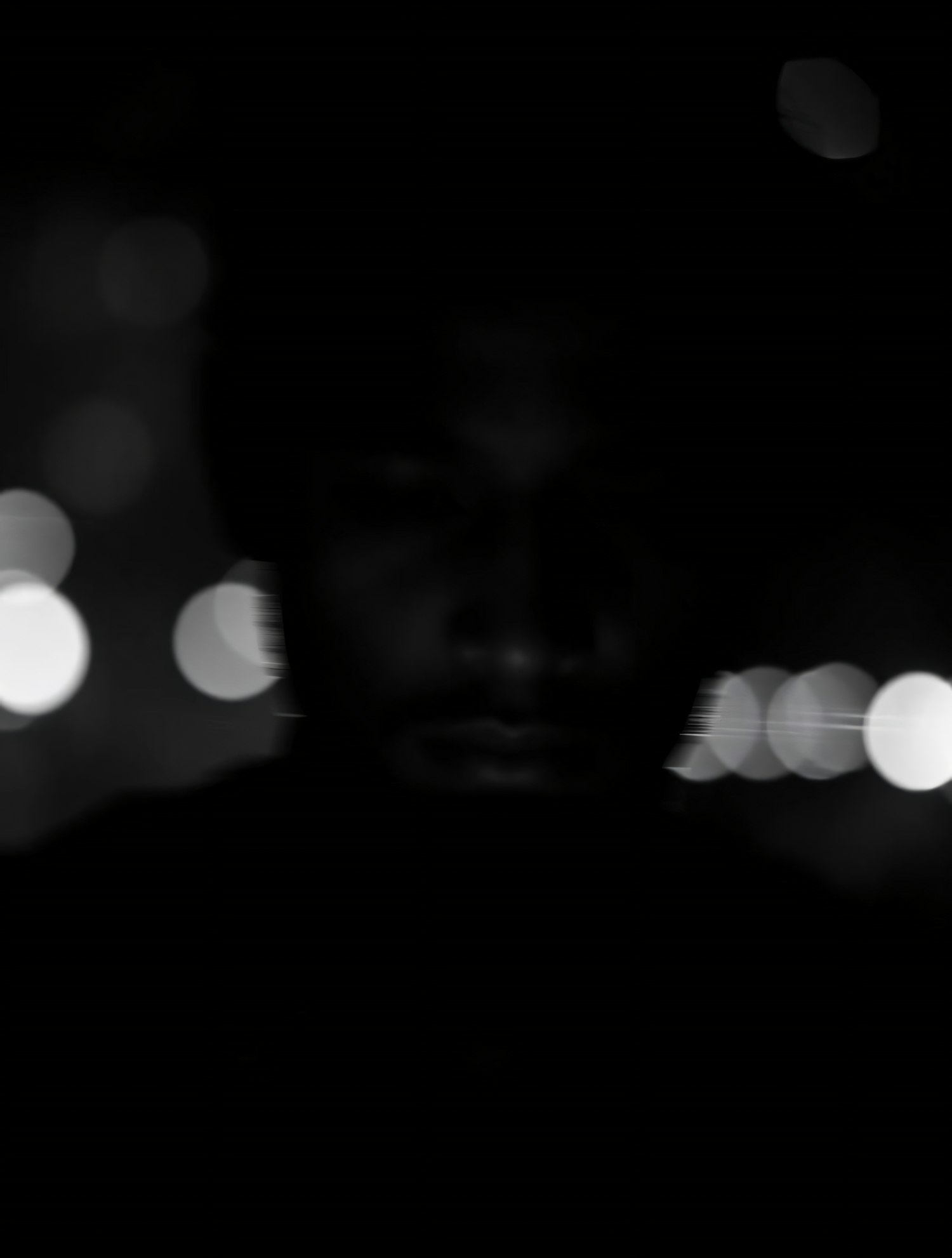 A silhouette against a blurred bokeh background of lights, creating a mysterious and introspective atmosphere.