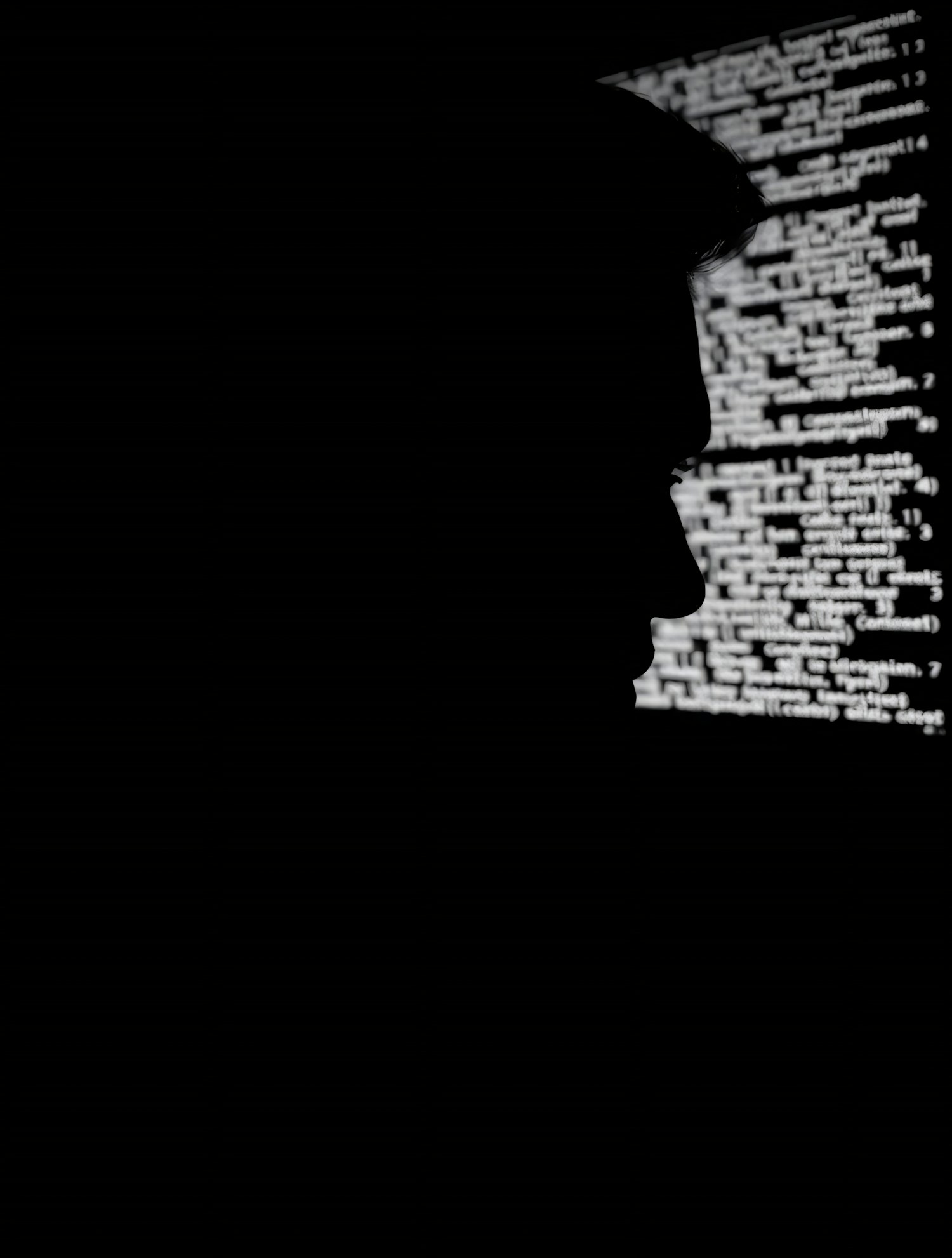 Silhouette of a person against a dark background with a screen displaying white programming code, creating a tech-focused atmosphere.