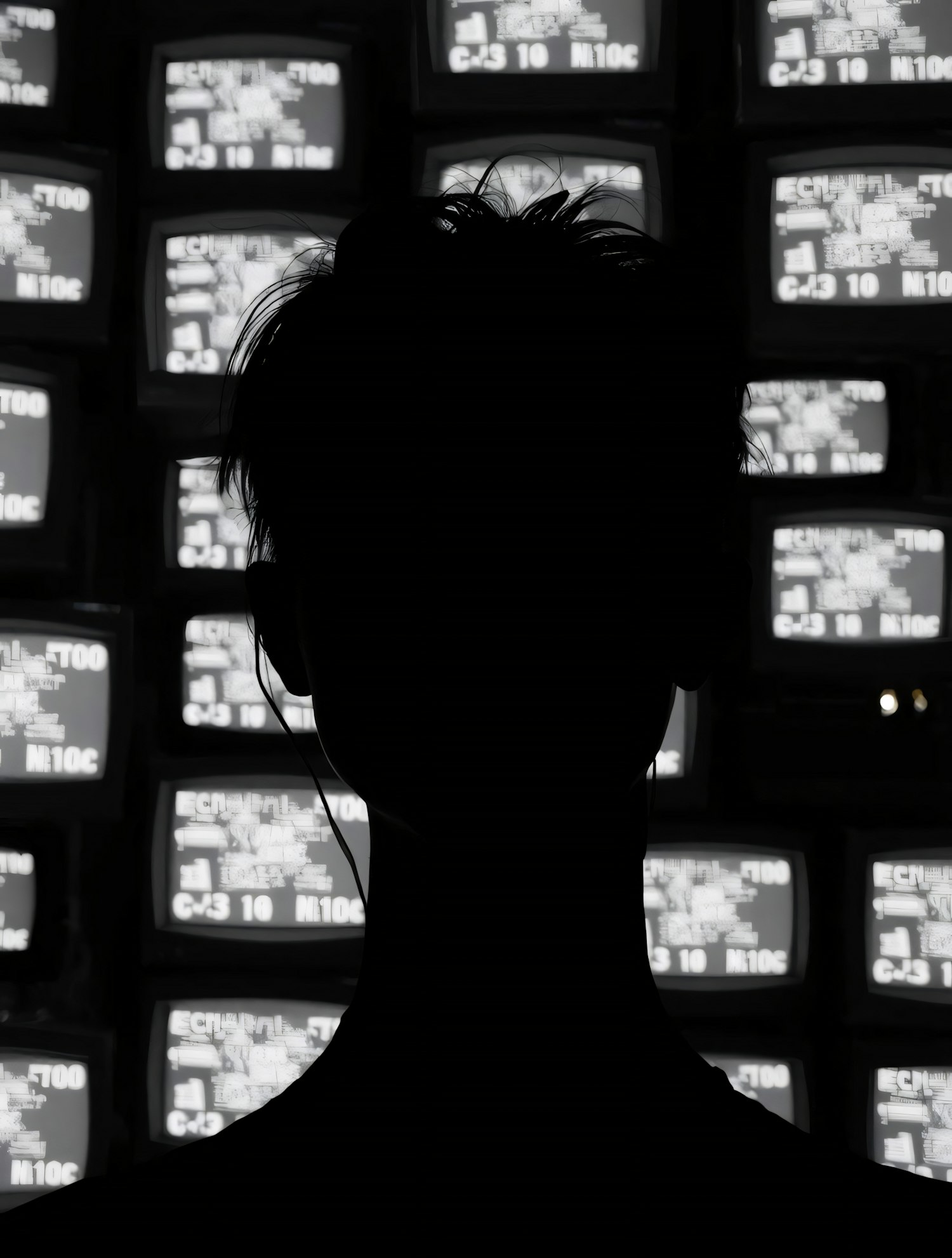 Silhouette of a person with headphones in front of a wall of CRT monitors displaying text, creating a striking black-and-white contrast.