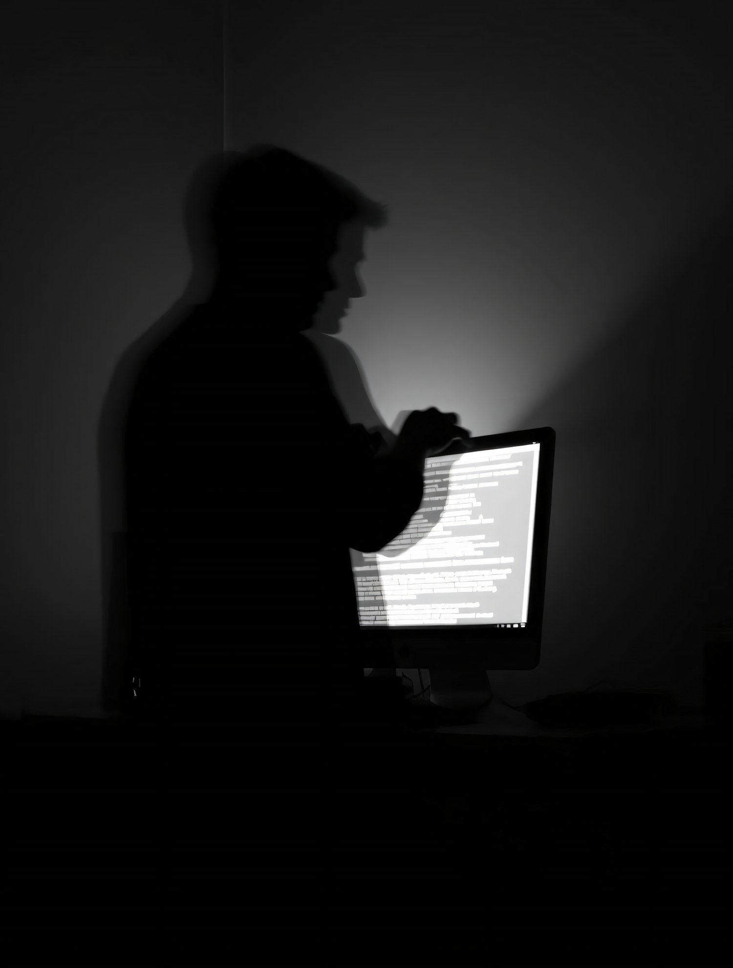 A silhouette of a person in a dark room interacts with a glowing computer screen displaying text, creating a mysterious atmosphere.