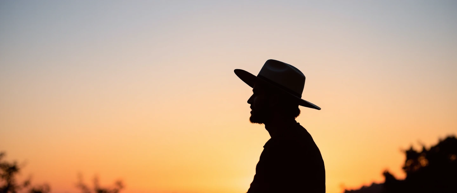 Silhouette of a man in a hat against a stunning sunset, with orange and blue hues creating a serene and contemplative atmosphere.