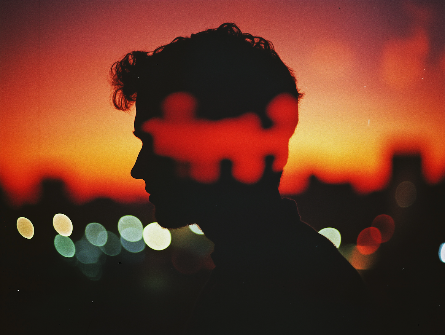 Silhouette of a man with a puzzle overlay against a vivid sunset and bokeh city lights, creating a dreamy and artistic vibe.