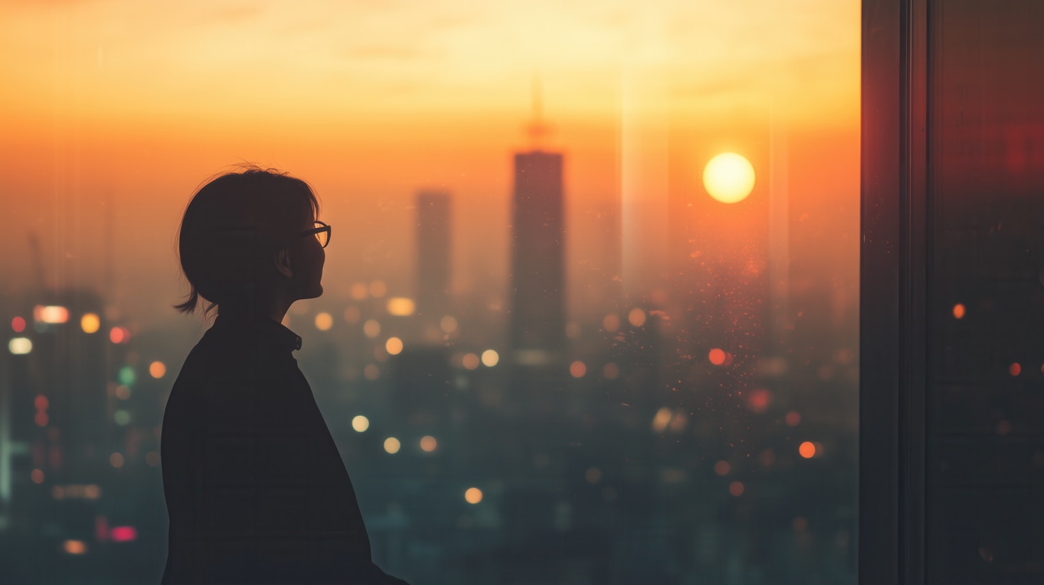 Silhouette of a person with glasses gazing at a vibrant sunset over a cityscape, with blurred city lights creating a dreamy atmosphere.