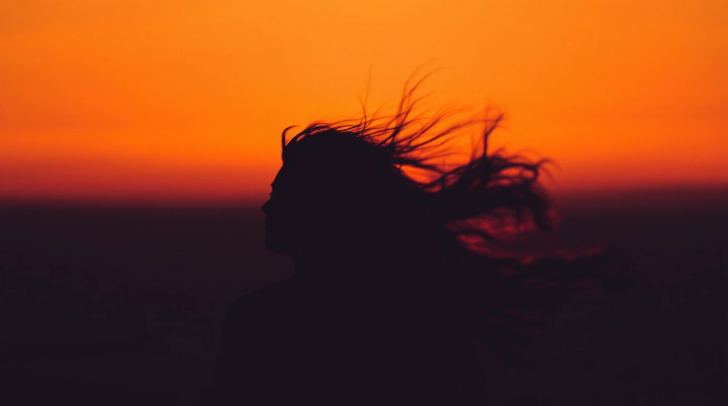 Silhouette of a person with flowing hair against a vibrant orange sunset, creating a dramatic and serene scene.