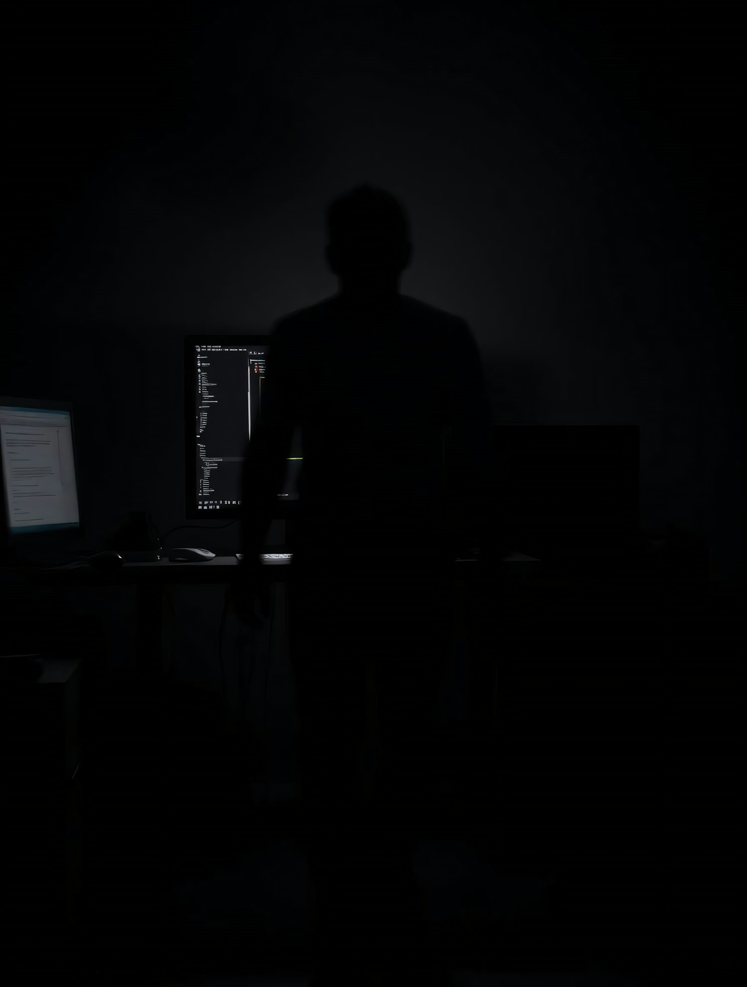 A silhouette of a person in a dark room, illuminated by computer monitors displaying code and text, creating a focused atmosphere.