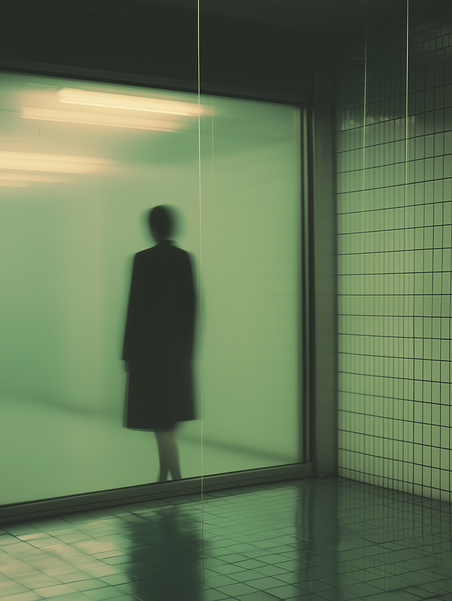 Mysterious silhouette behind frosted glass in a green-tinted room with tiled walls and floors, creating an ethereal atmosphere.