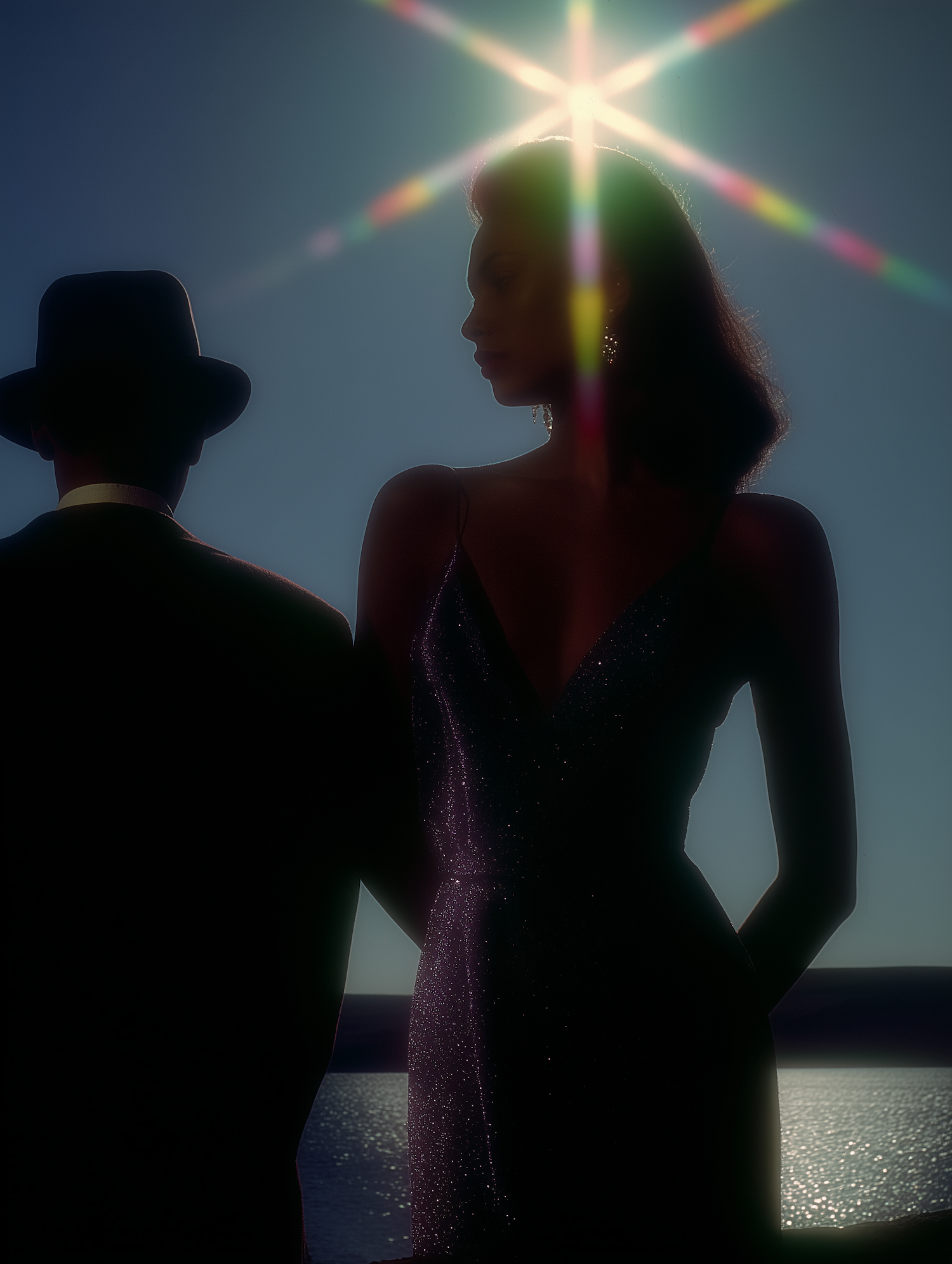 Silhouetted couple by a shimmering lake under a dramatic sunburst, evoking a cinematic and romantic atmosphere.