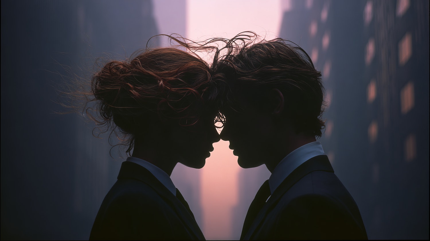 Silhouetted figures in an intimate pose against a cityscape at dusk, with dramatic lighting and a serene urban atmosphere.
