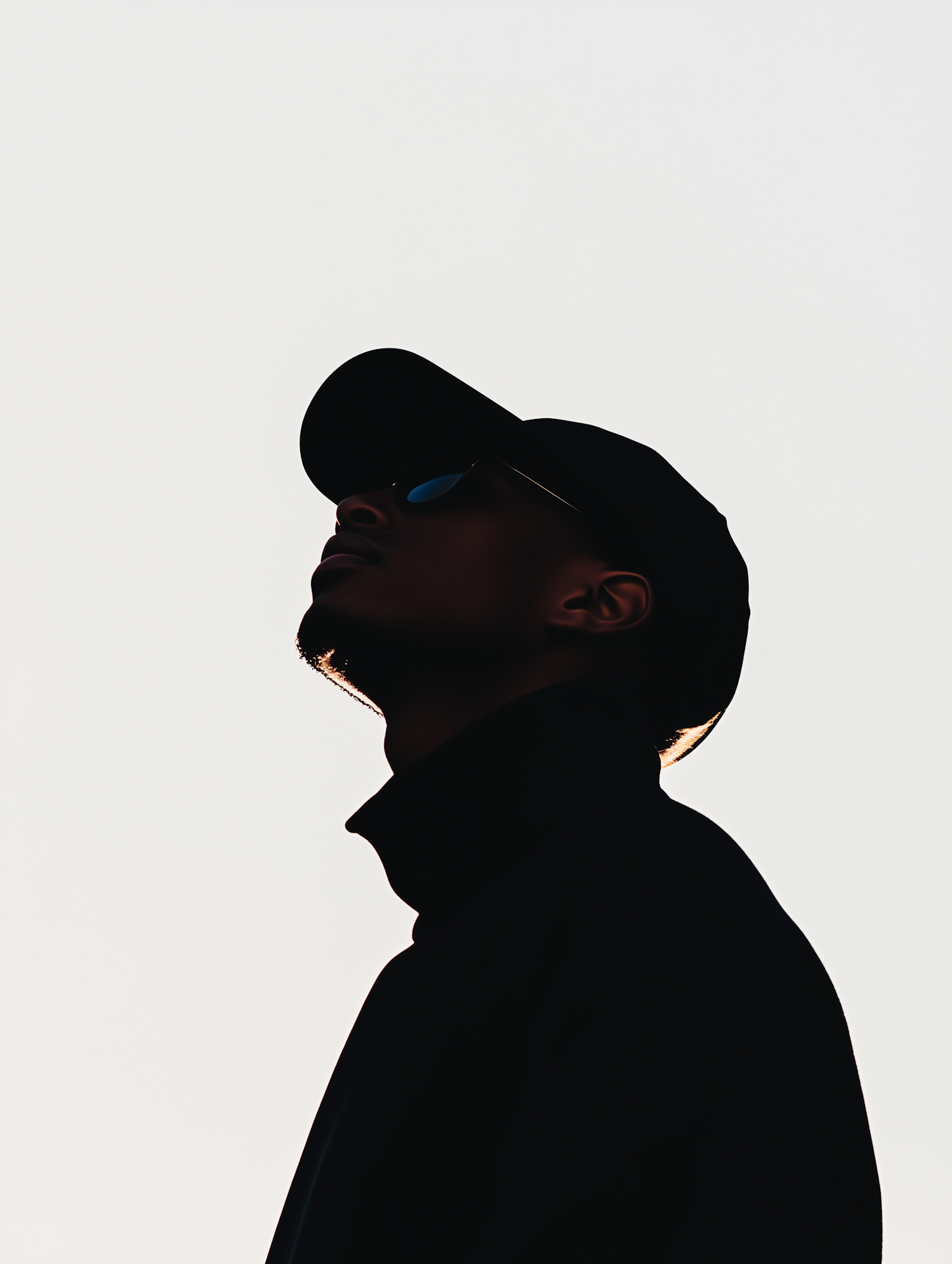 Silhouette of a person in a cap and sunglasses, looking upwards against a bright background, creating a mysterious and minimalist effect.