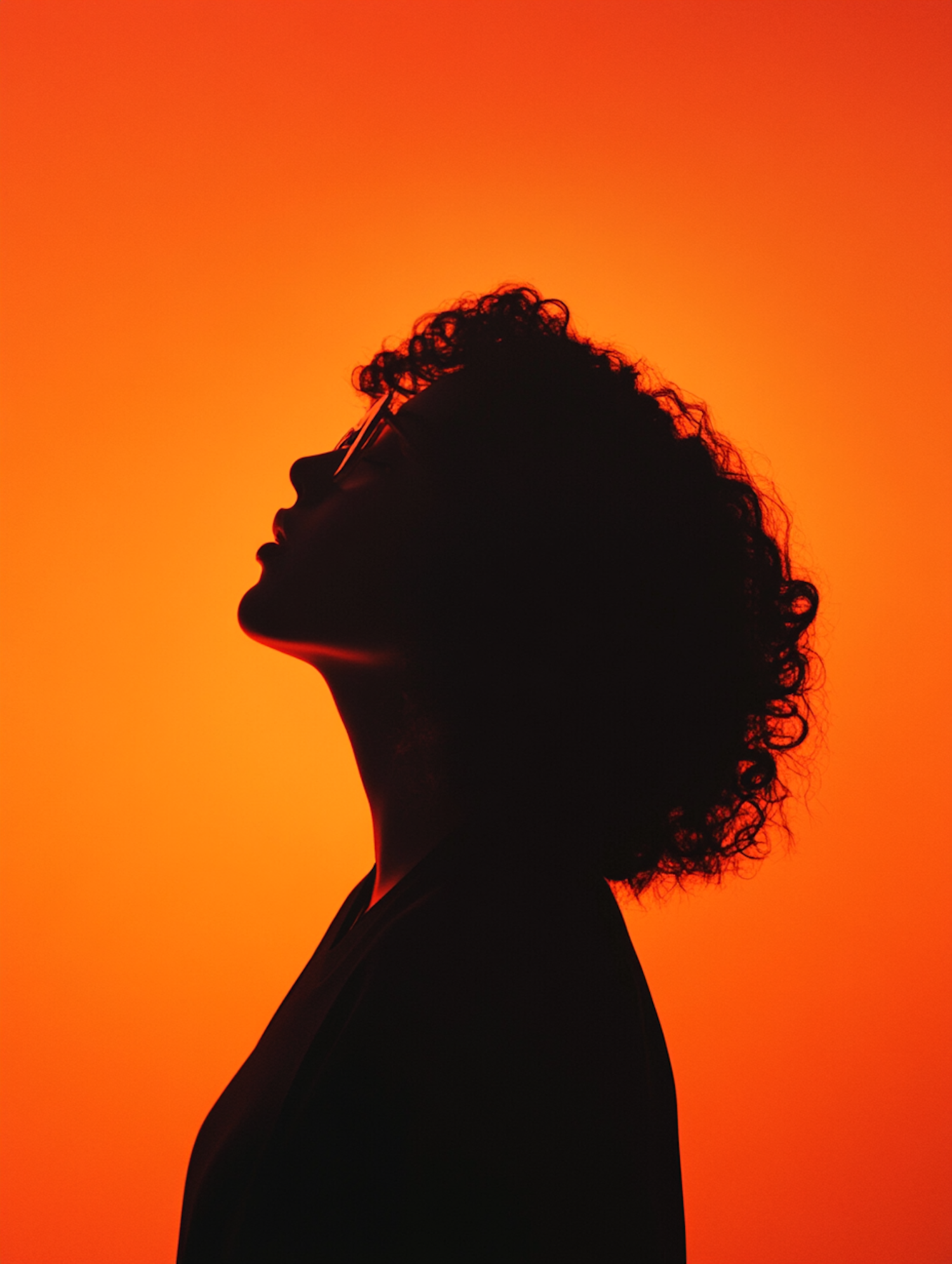 Silhouette of a person with curly hair and glasses in profile against a glowing orange background, evoking a sense of introspection.