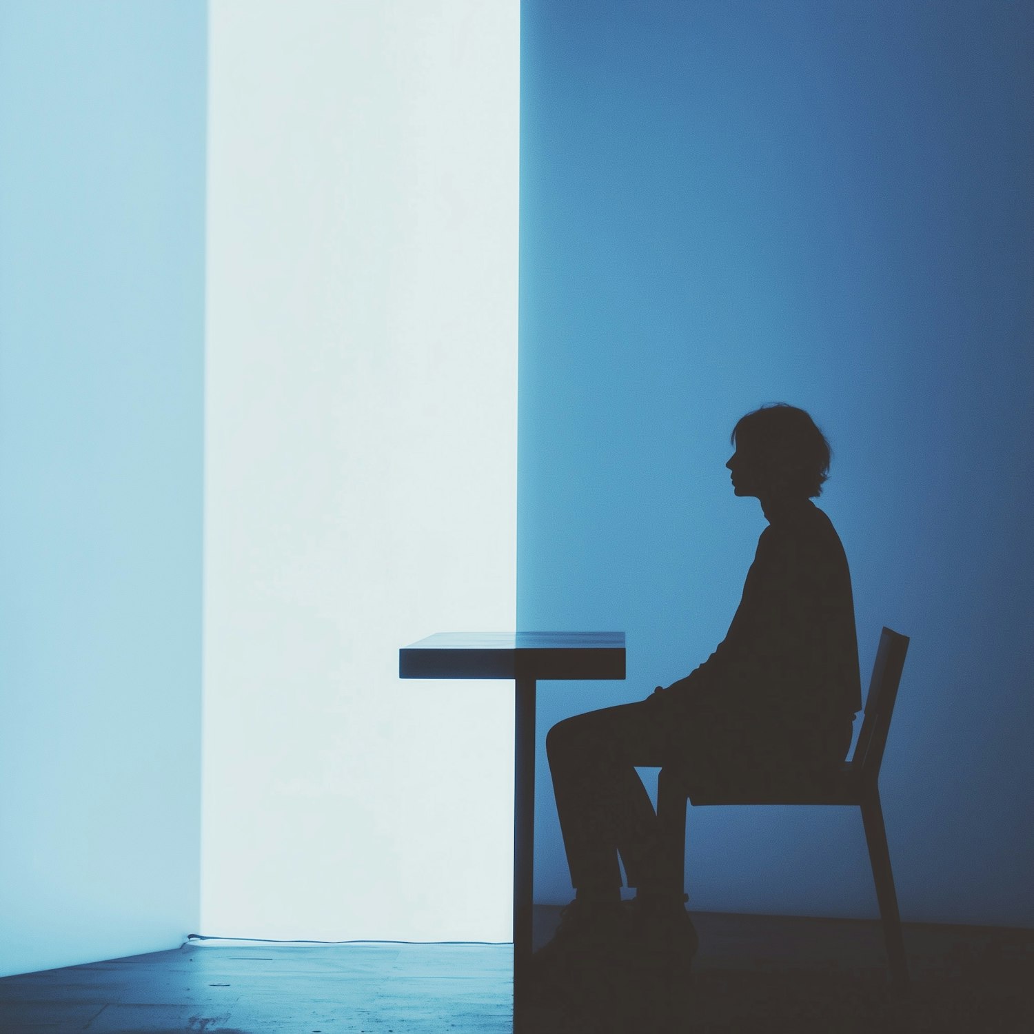 Silhouette of a person sitting at a table, with a striking split background of white and blue light. Minimalist and contemplative vibe.