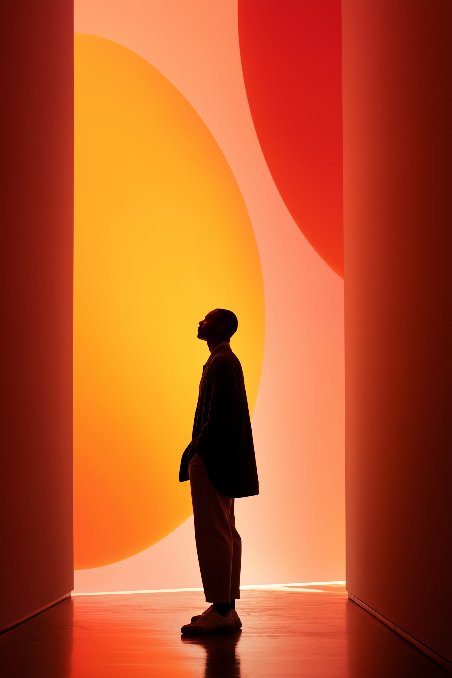 Silhouette of a man in a vibrant, abstract setting with glowing orange and red circular shapes and reflective flooring.