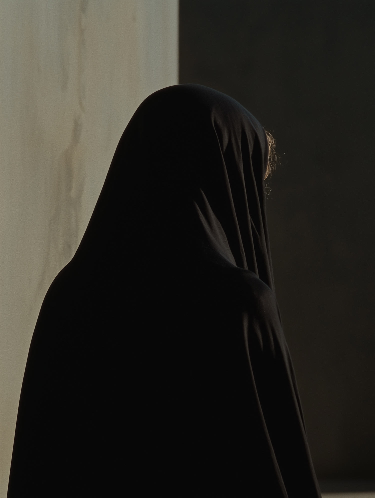 A mysterious figure in a black cloak stands against a neutral background, with light brown hair peeking out, creating a contemplative mood.