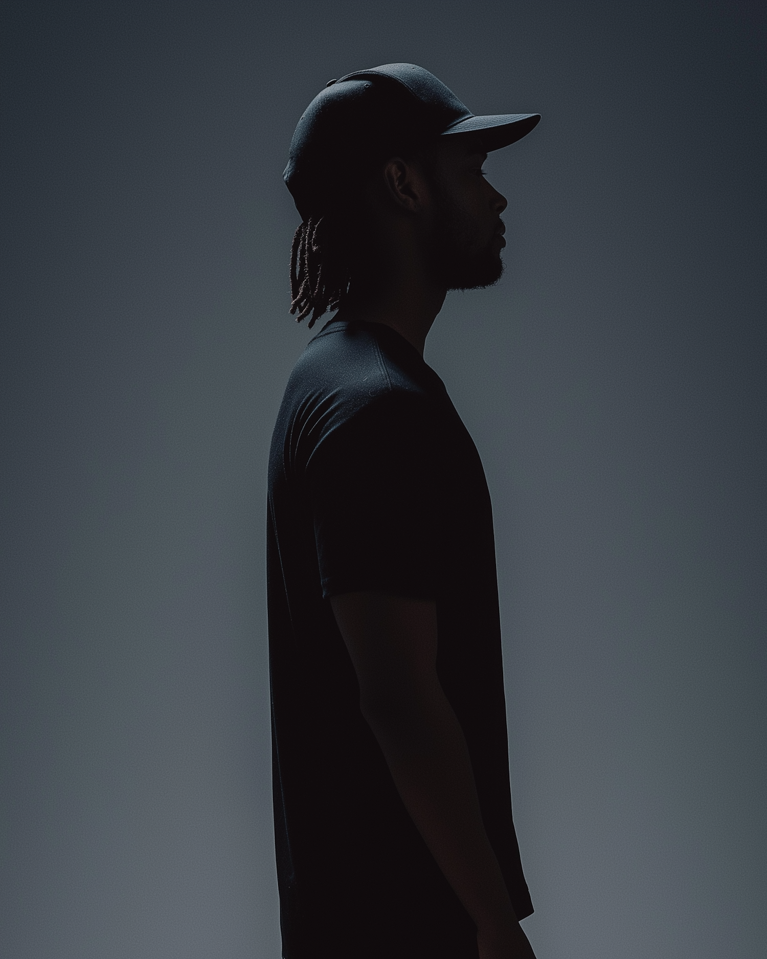 Silhouette of a man in a black cap and t-shirt, with short dreadlocks, set against a dimly lit background.