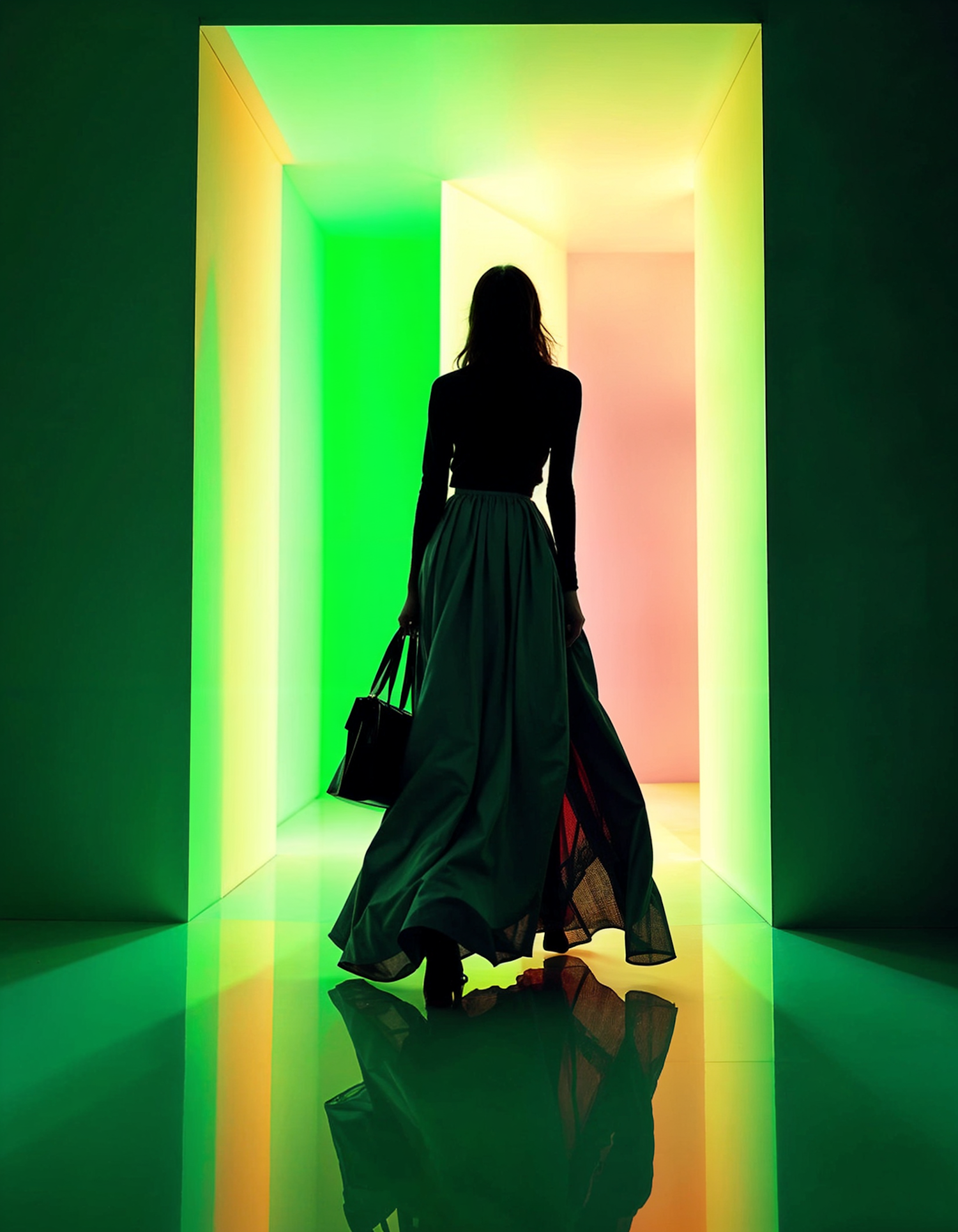 Silhouette of a woman walking through a glowing corridor with vibrant green, yellow, and pink lights, carrying a handbag. Modern and artistic.