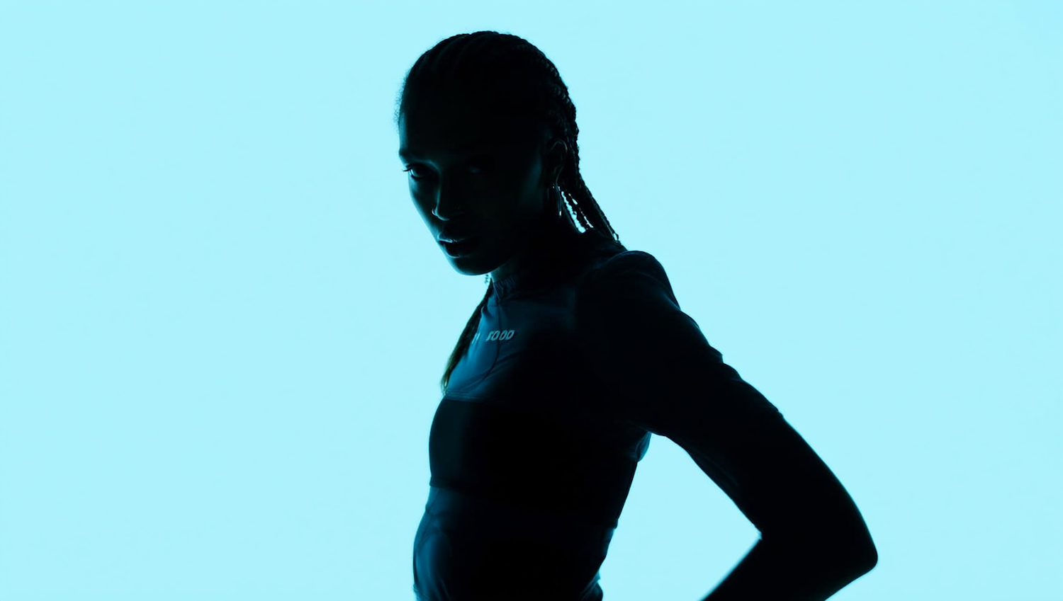 Silhouette of a person with braided hair against a cyan background, creating a striking contrast with dramatic lighting.