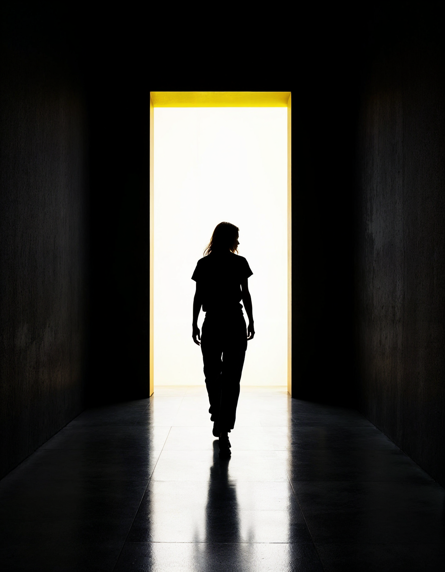 Silhouette of a person walking through a bright doorway, surrounded by dark walls, creating a dramatic contrast and sense of mystery.