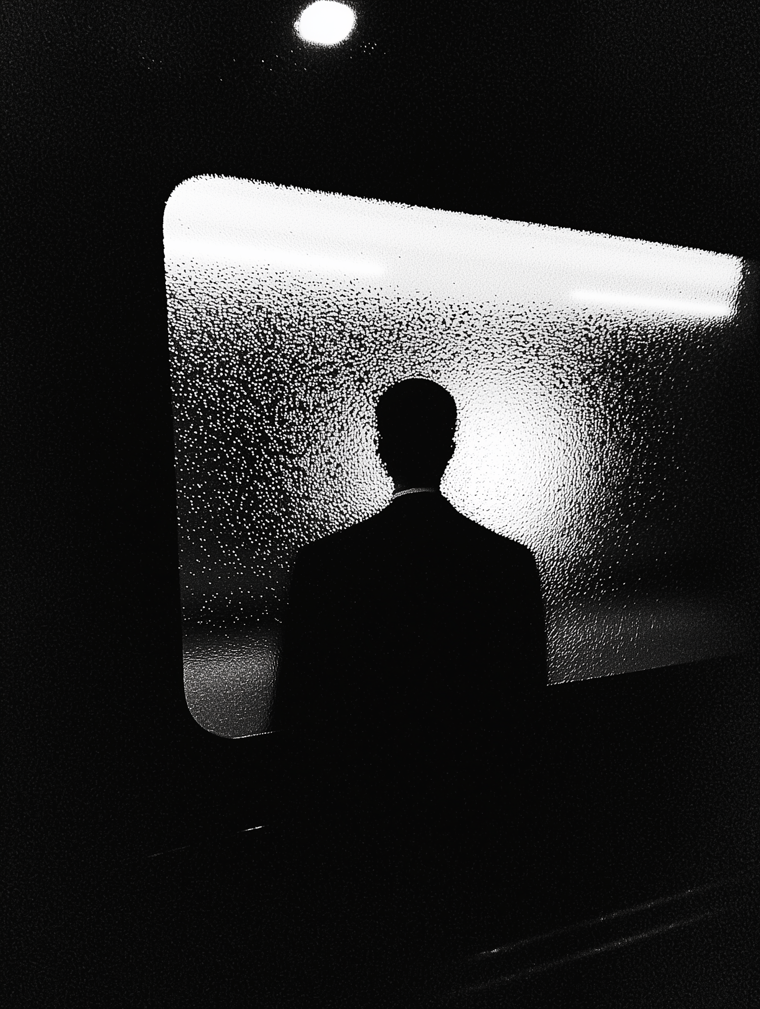 Silhouette of a person in a suit against a bright, textured window, creating a dramatic black and white contrast.