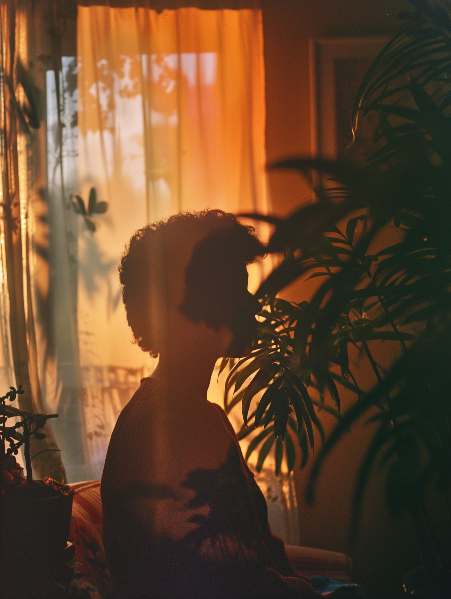 Silhouette of a person with curly hair against a warm, golden backdrop, surrounded by plants and intricate shadows, creating a serene atmosphere.