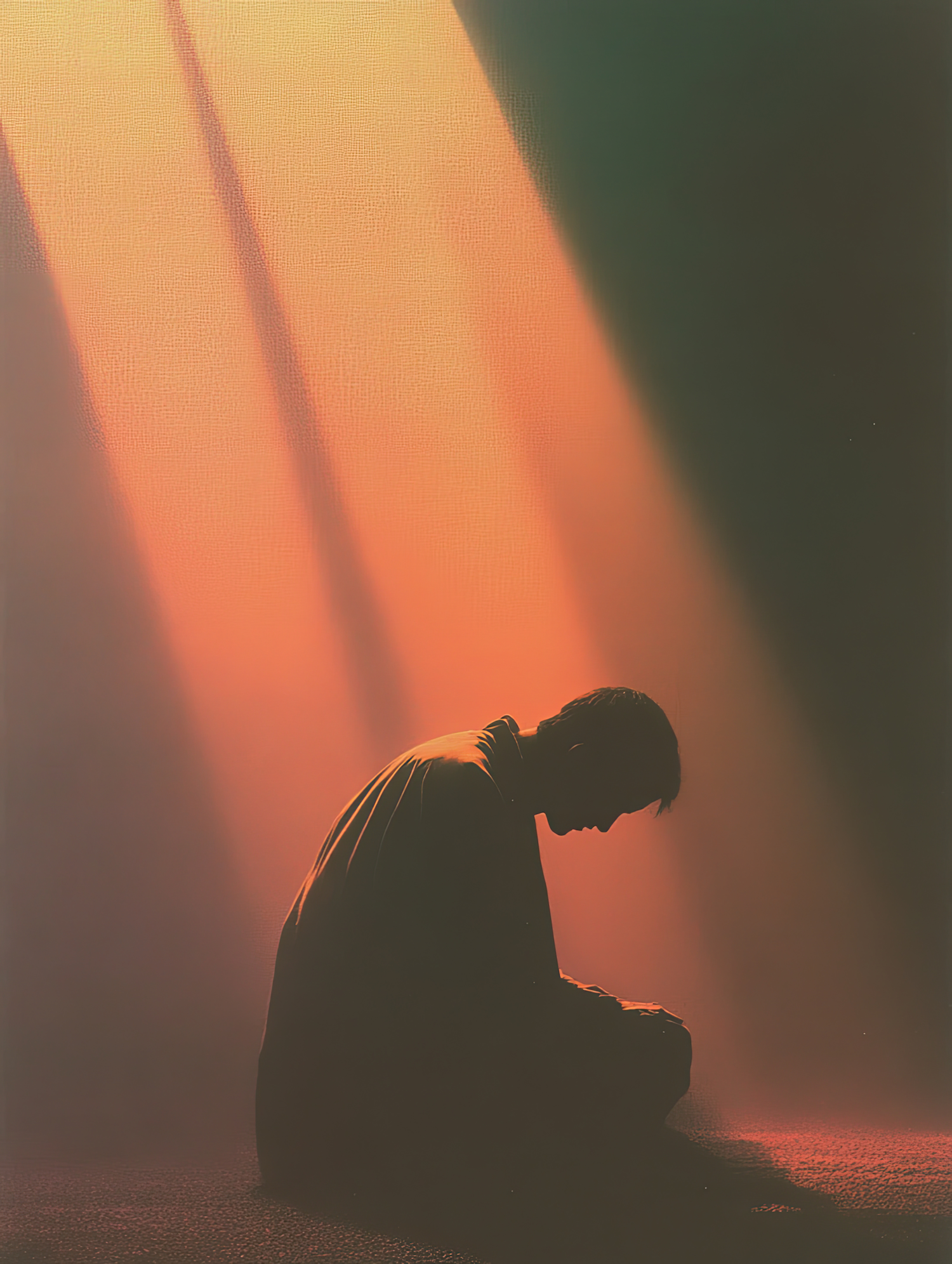 A silhouette of a person kneeling in warm, golden light beams, creating a serene and reflective atmosphere in a darkened space.
