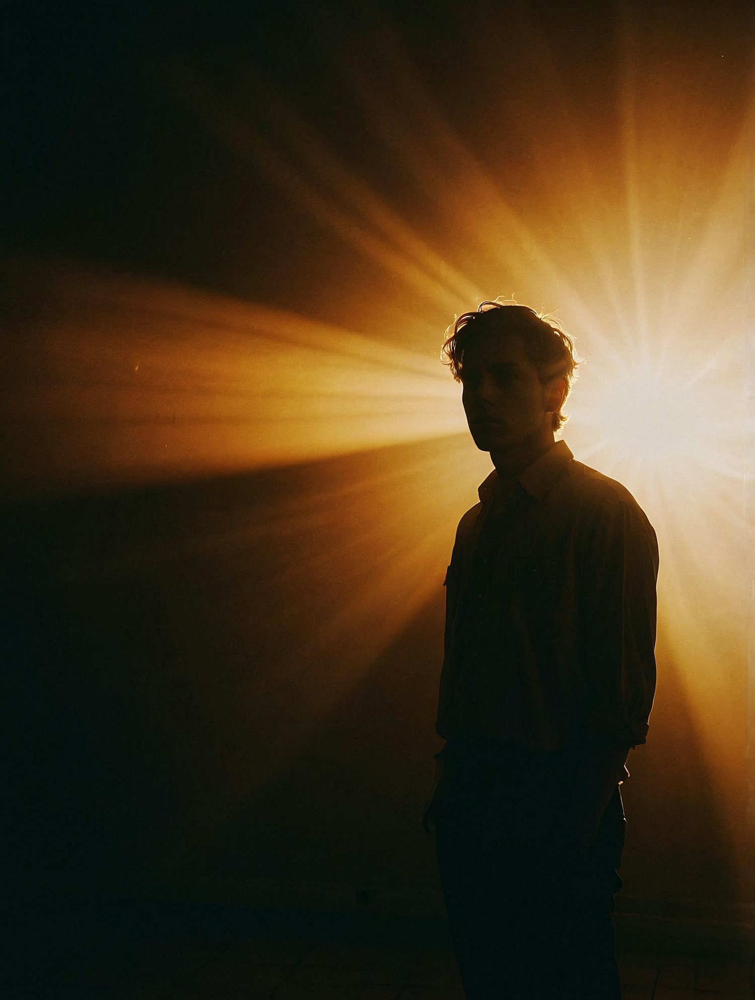 Silhouette of a man against radiant golden light rays, creating a dramatic and cinematic atmosphere with striking contrasts.