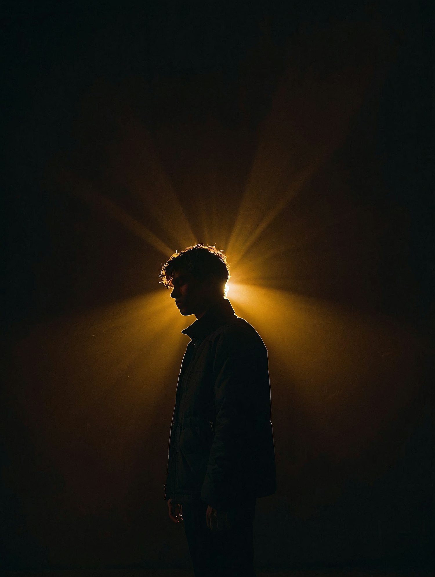 Silhouette of a person with golden light radiating behind them, creating a dramatic halo effect against a dark background.