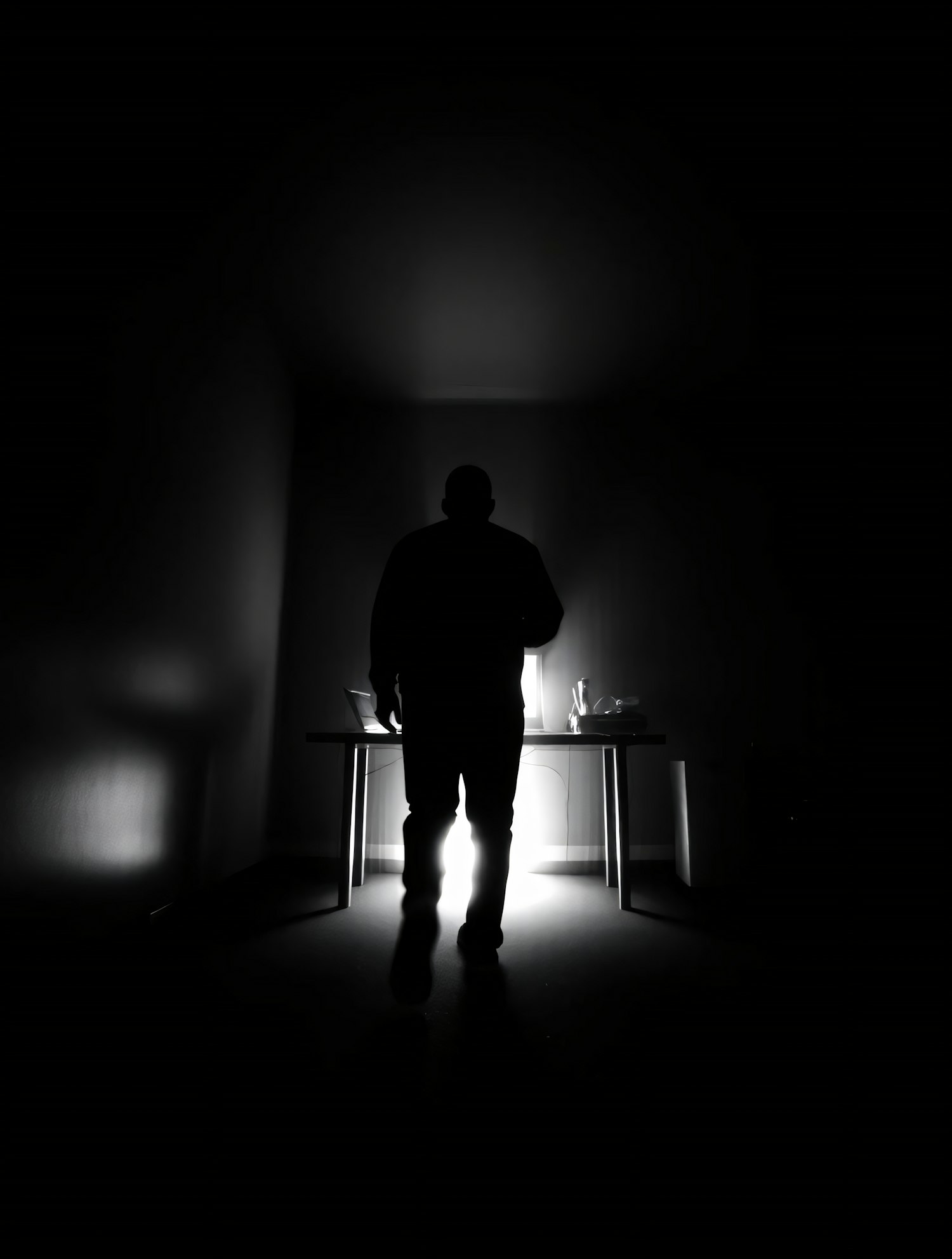 A silhouette of a person in a dark room, illuminated by a bright light behind a table, creating a dramatic and mysterious atmosphere.