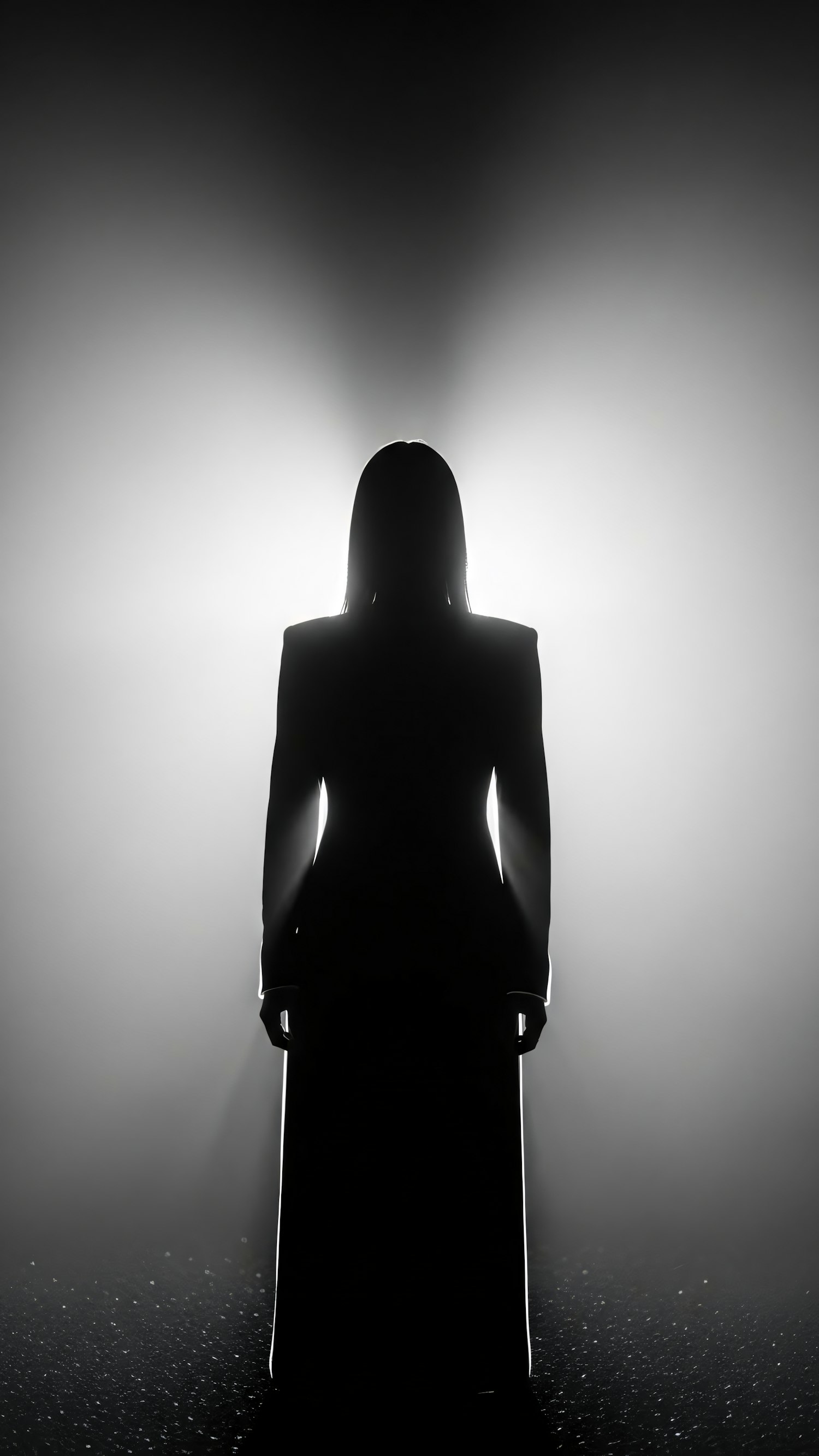 A silhouette of a person in a long garment, illuminated from behind, creating a dramatic and mysterious atmosphere.