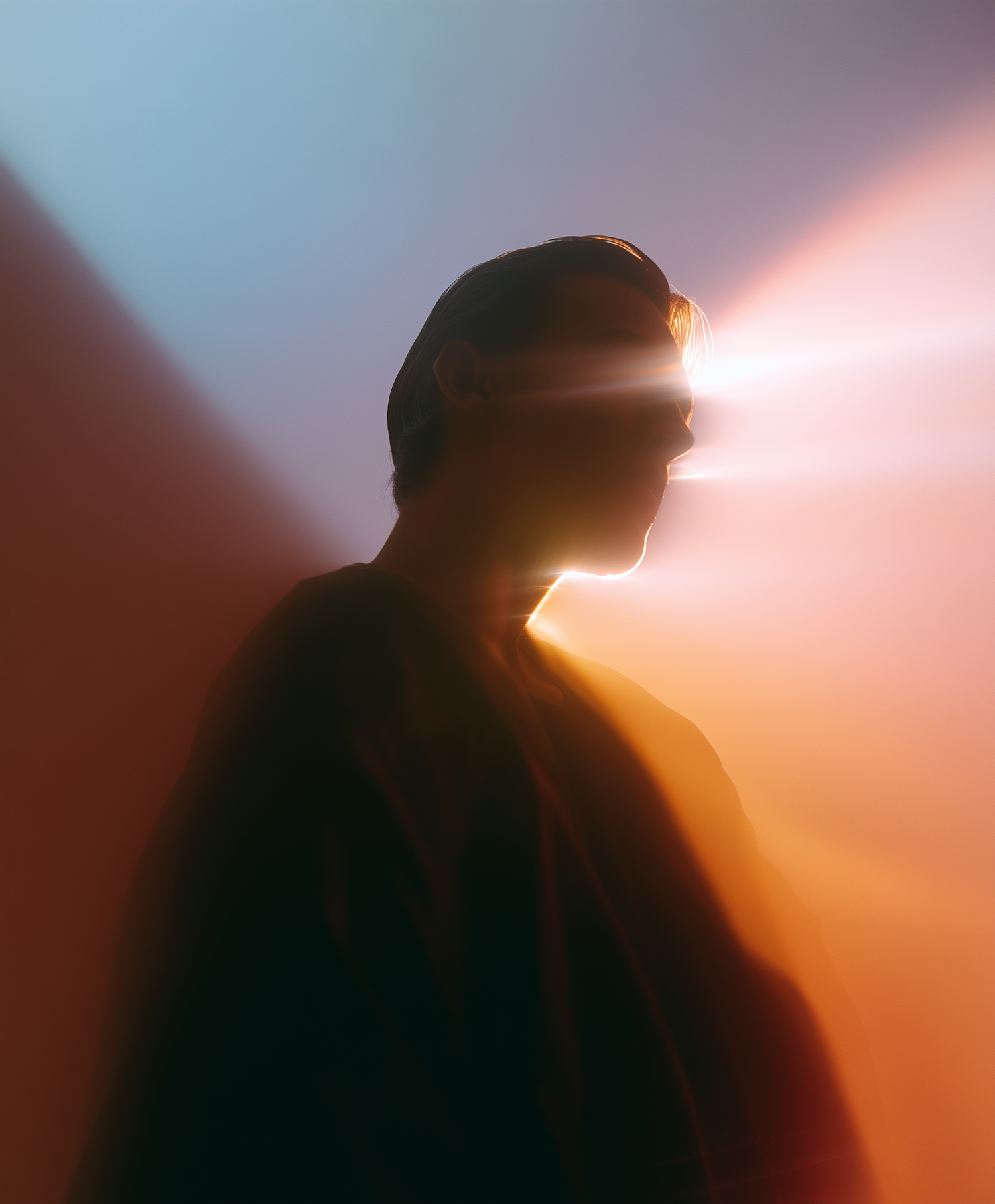 A silhouette of a person against a gradient background with dramatic light rays and lens flare, creating a mysterious and artistic effect.