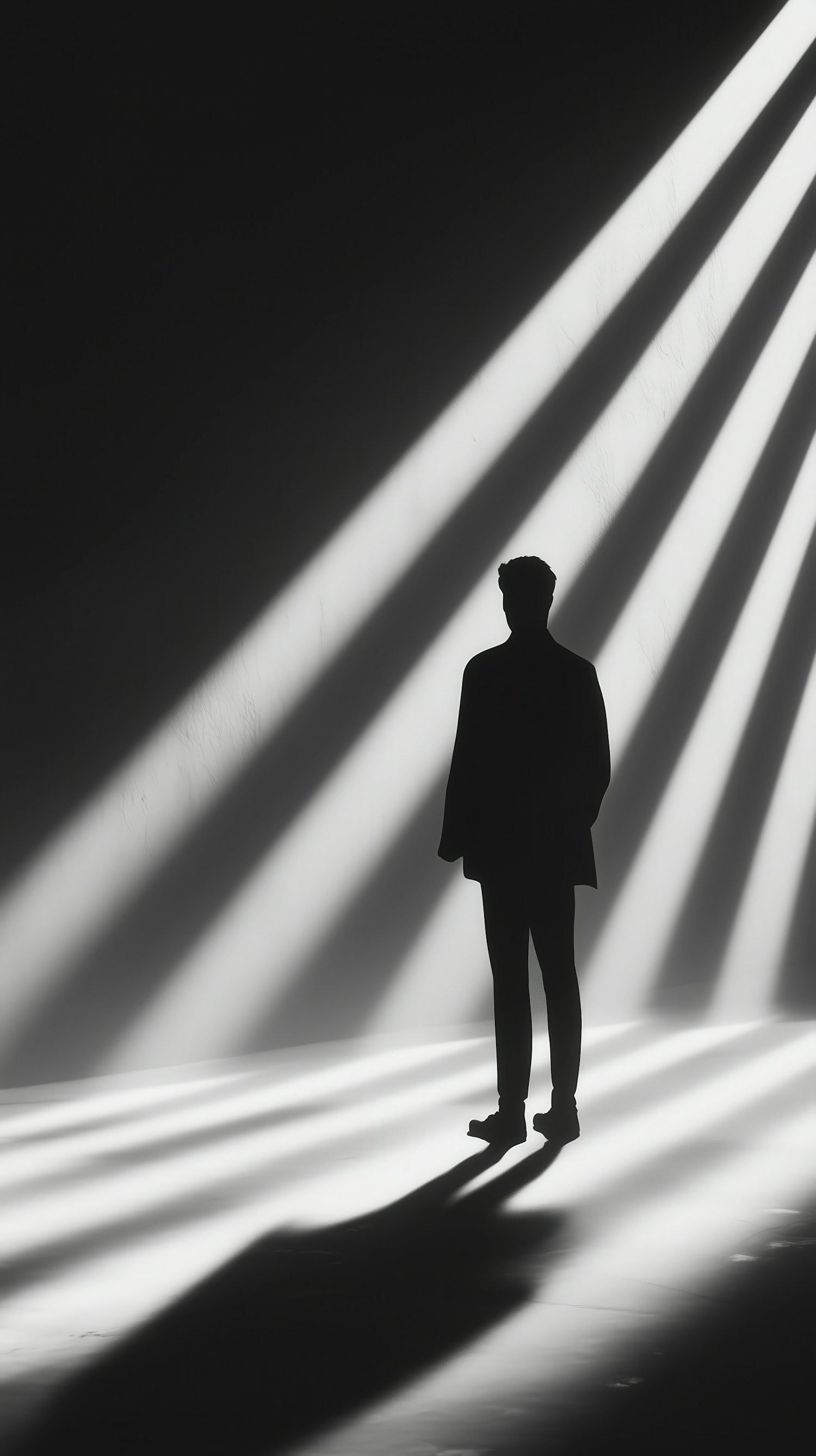 Silhouette of a person standing in dramatic light beams, creating sharp contrasts and elongated shadows in a minimalist setting.