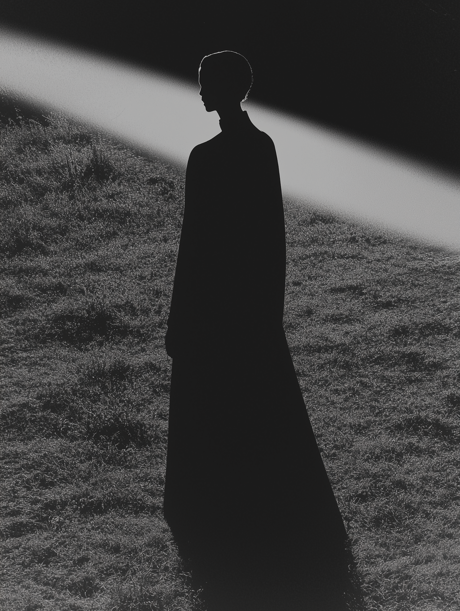 Silhouette of a person in a long garment against a dramatic light and shadow background on a grassy field.