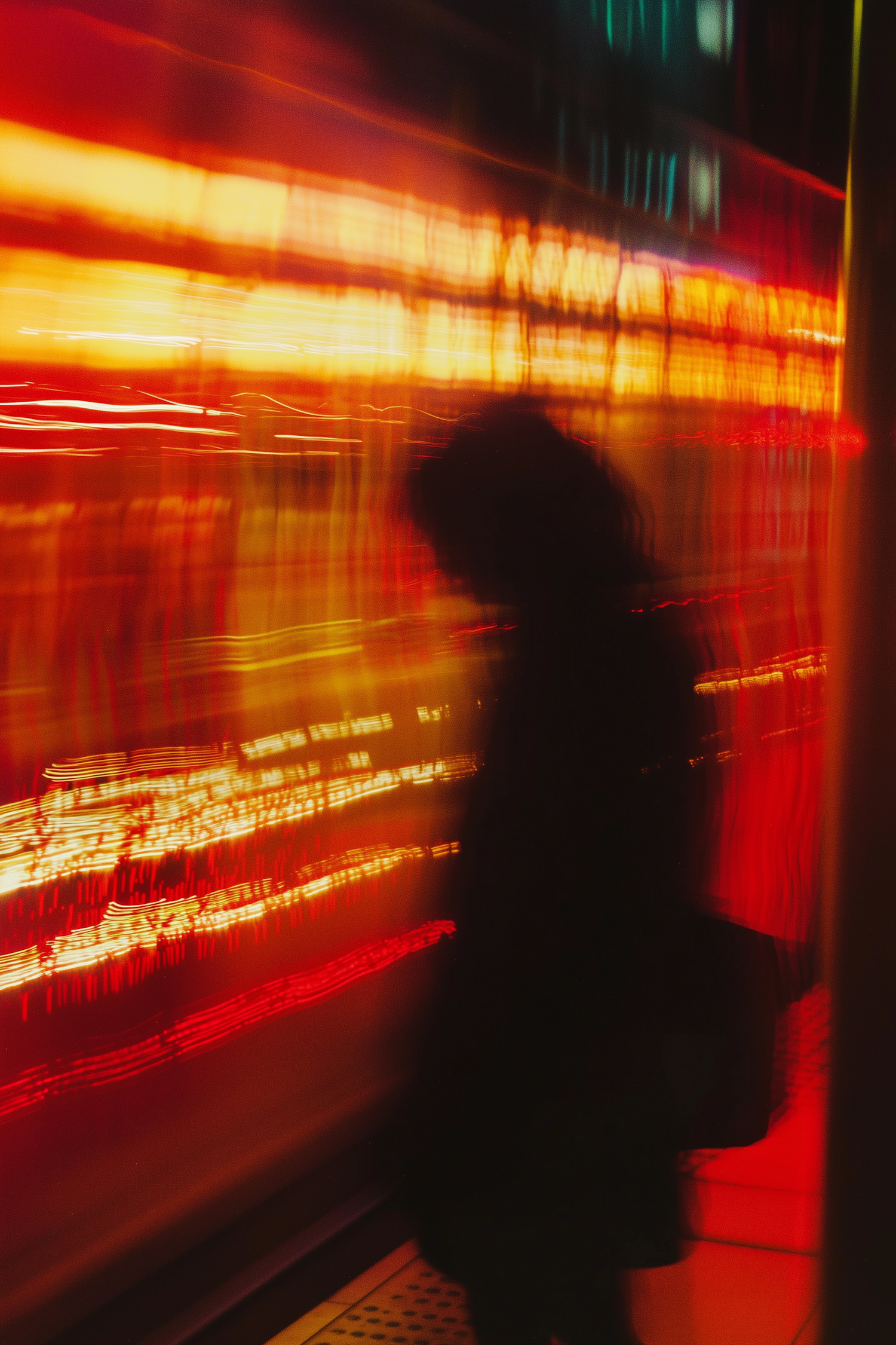 Silhouette of a person against streaking red and orange lights, evoking motion and mystery in a vibrant urban setting.