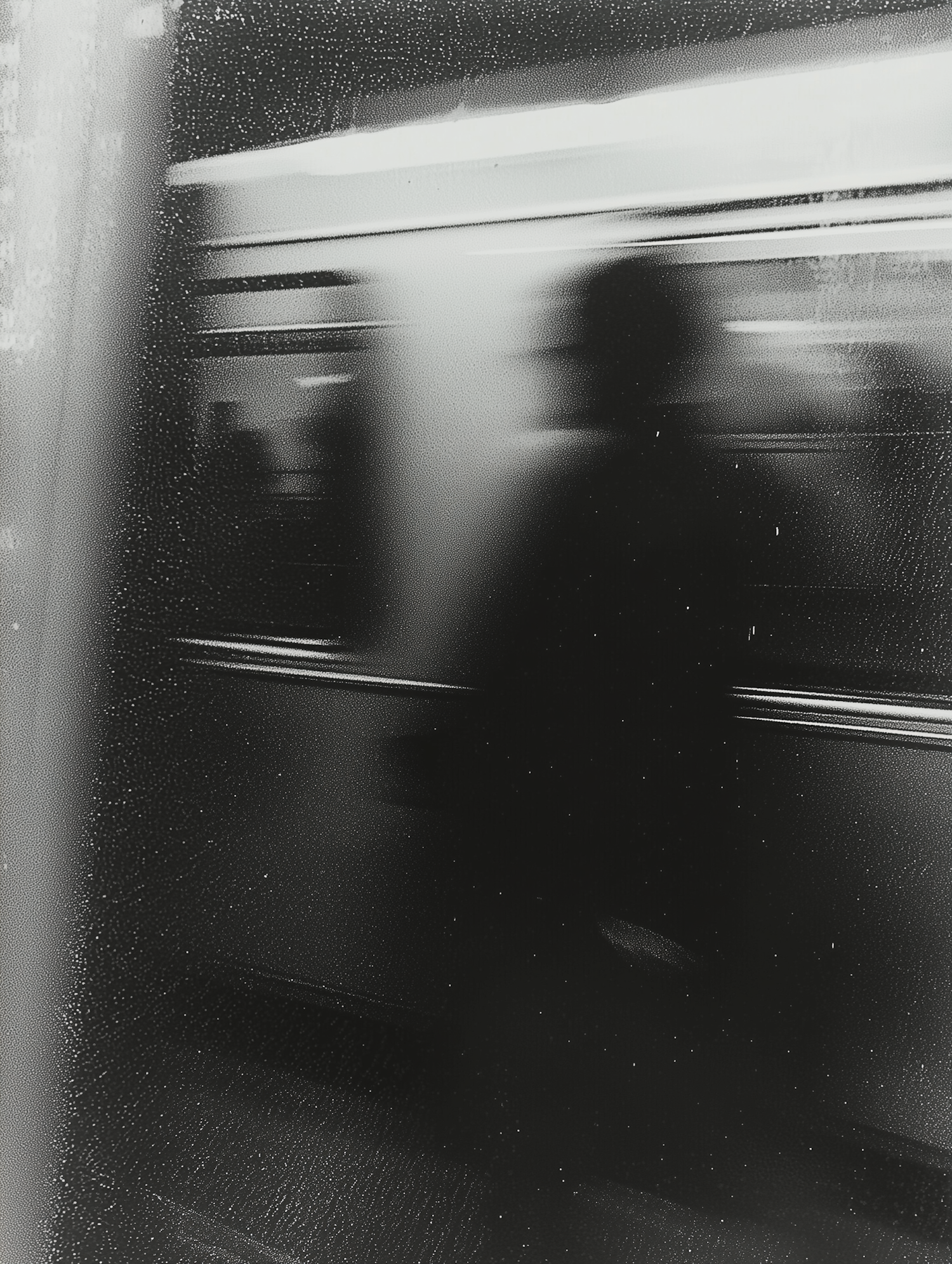 Blurred black and white image of a subway train in motion, with raindrops on the window and a faint silhouette of a person.