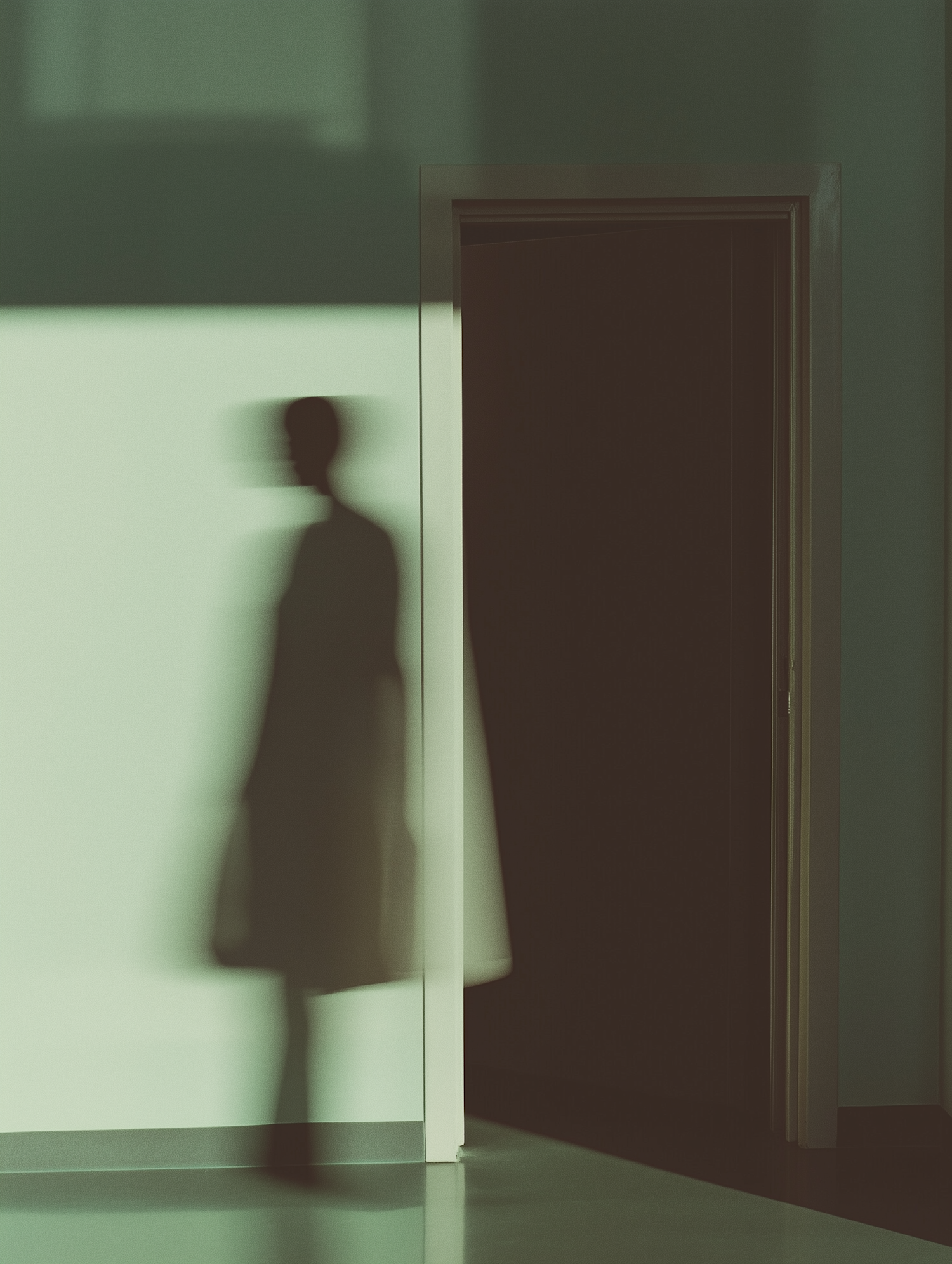 Mysterious shadowy figure in dim hallway, casting long shadow. Muted greens and browns create an eerie, suspenseful atmosphere.