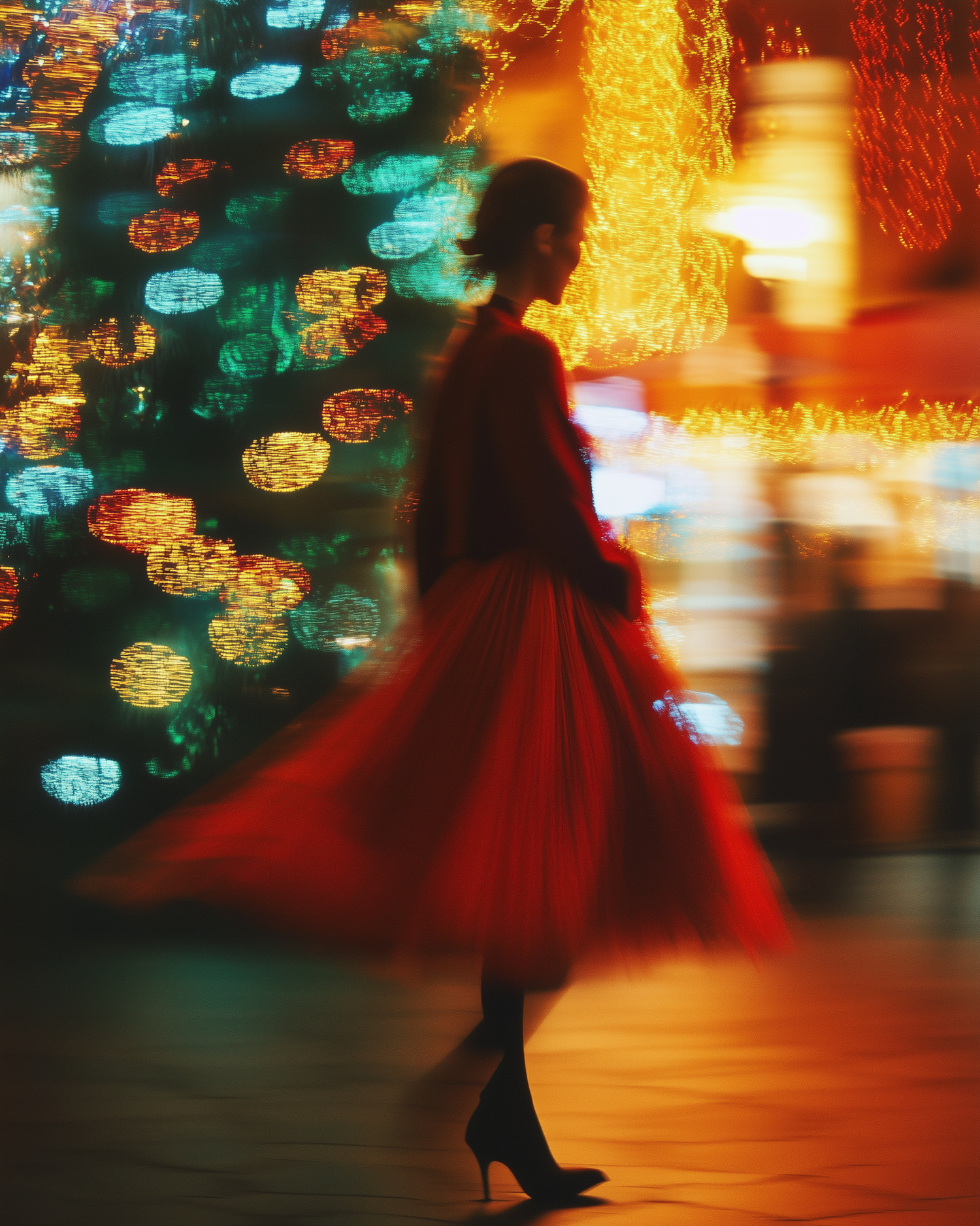 Blurred motion of a woman in a red dress walking past colorful city lights, creating a dynamic and festive atmosphere.
