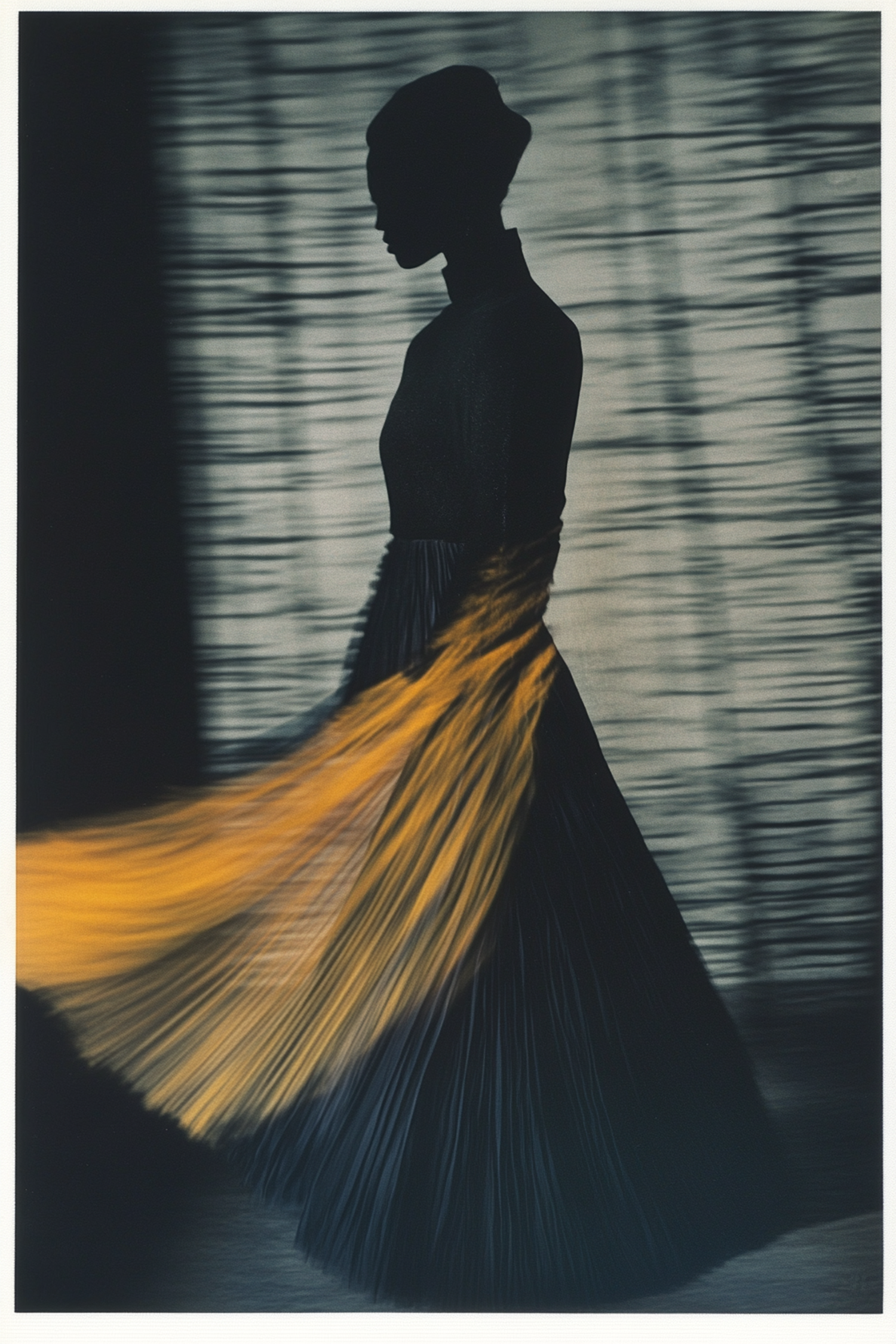 Silhouette of a person in a flowing gown with a dynamic yellow streak, set against a textured, blurred background for an artistic effect.