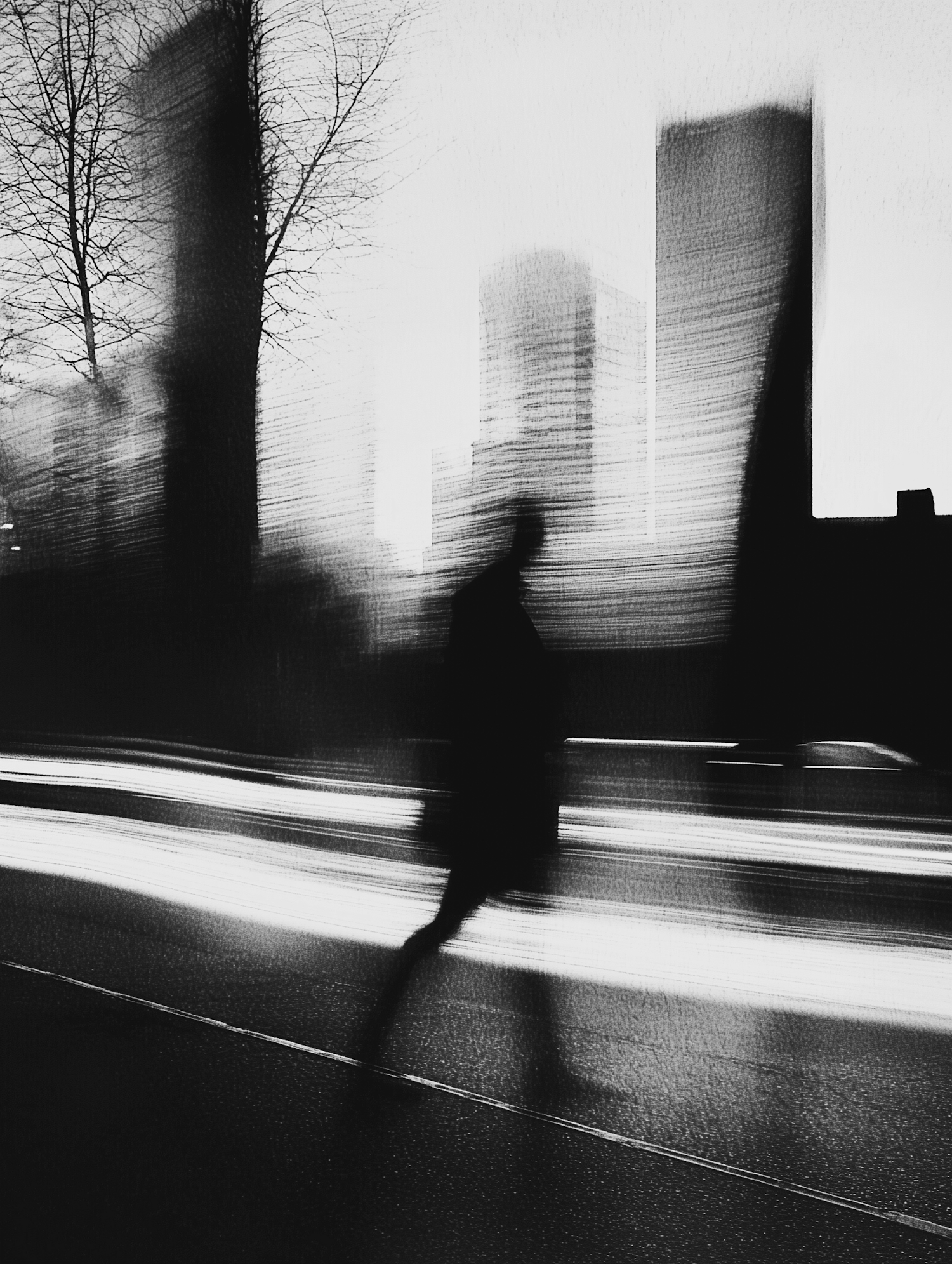 Blurred silhouette of a person walking in a cityscape with light streaks and tall buildings in black and white.