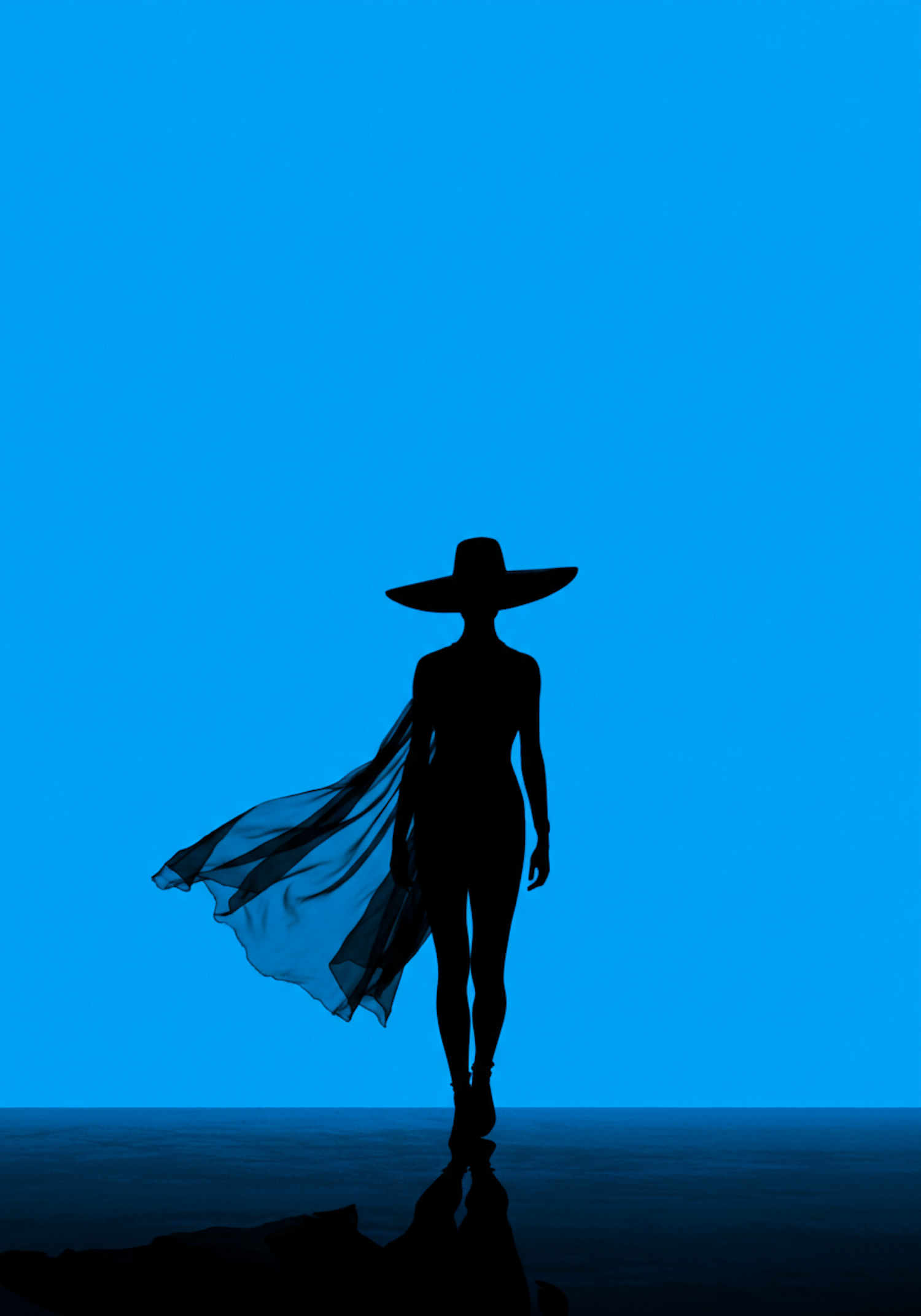 Silhouette of a person in a wide-brimmed hat and flowing cape against a vivid blue background, creating a dramatic and minimalist scene.
