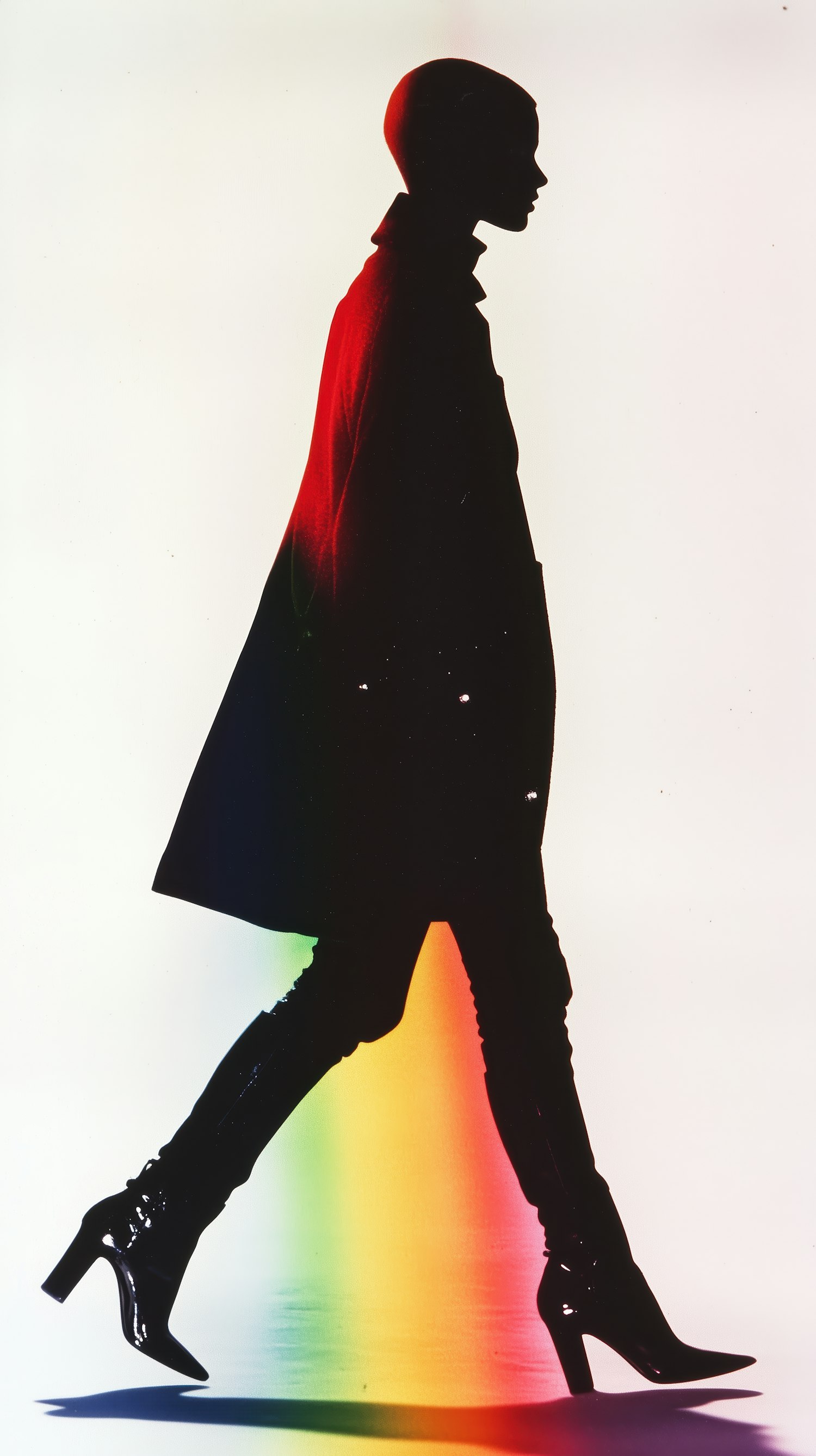 Silhouette of a person in a long coat and high-heeled boots against a colorful gradient background.