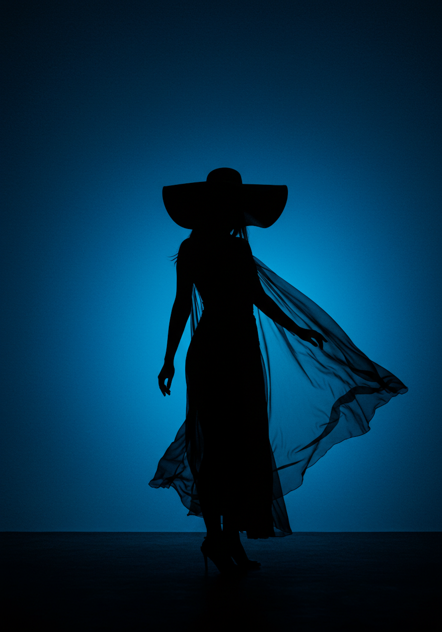 Silhouette of a person in a wide-brimmed hat and flowing dress against a glowing blue background, creating a mysterious and elegant vibe.