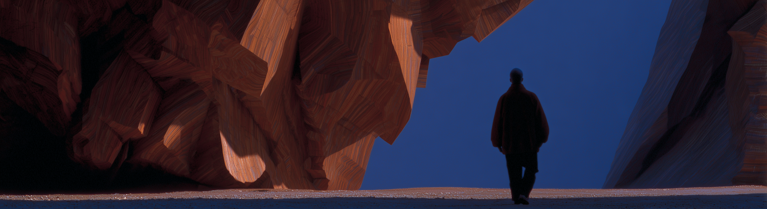 A lone figure walks near towering orange rock formations under a deep blue sky, showcasing nature's grandeur and solitude.