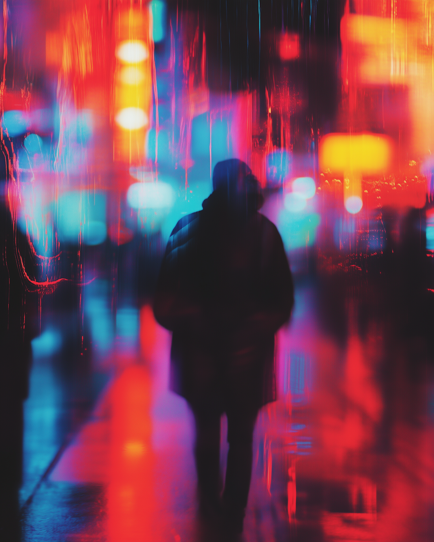 Silhouette in vibrant neon cityscape with blurred lights in red, blue, and orange, creating a mysterious and dynamic urban scene.