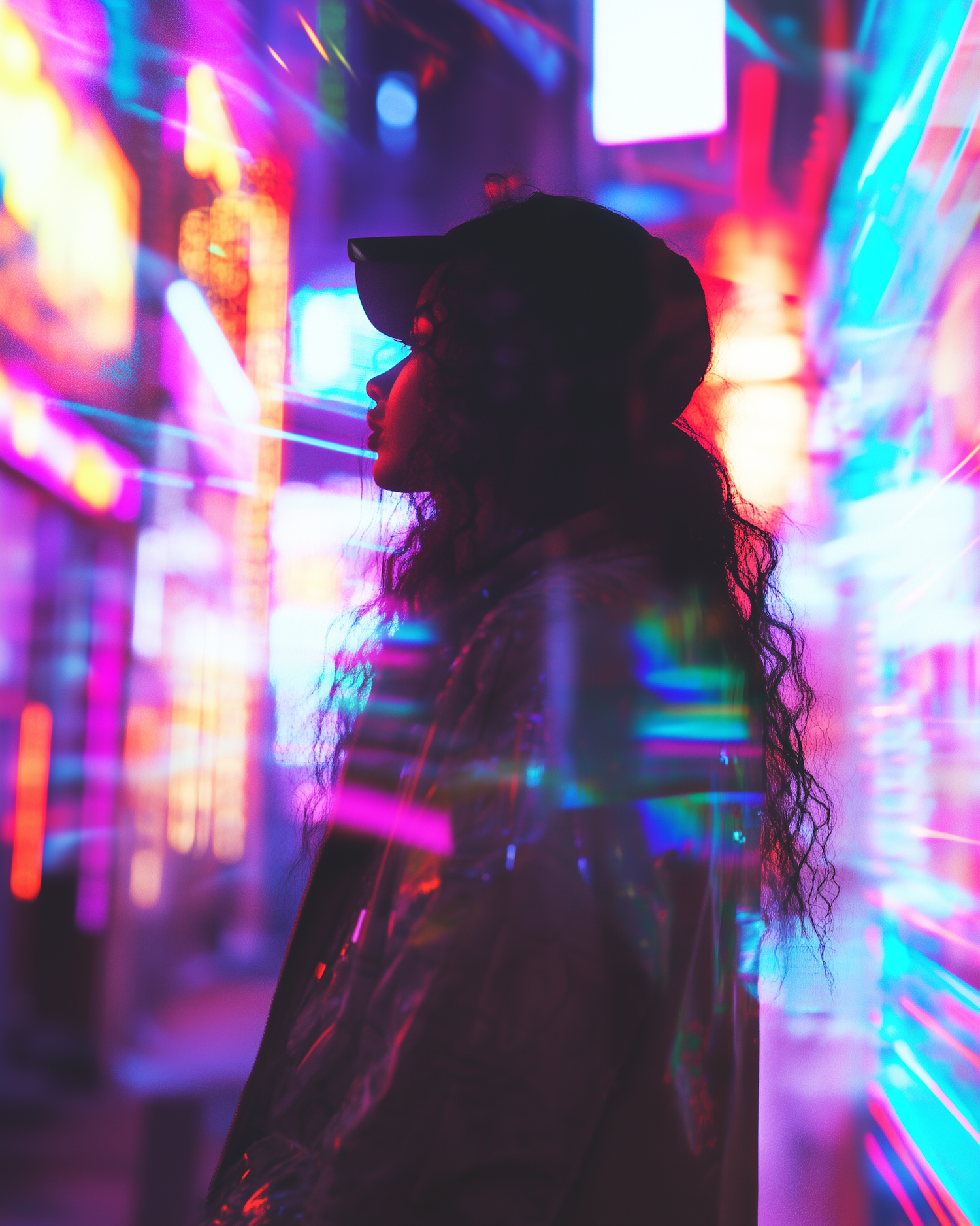 Silhouette of a person in a cap against vibrant neon lights, creating a dynamic and colorful urban night scene.