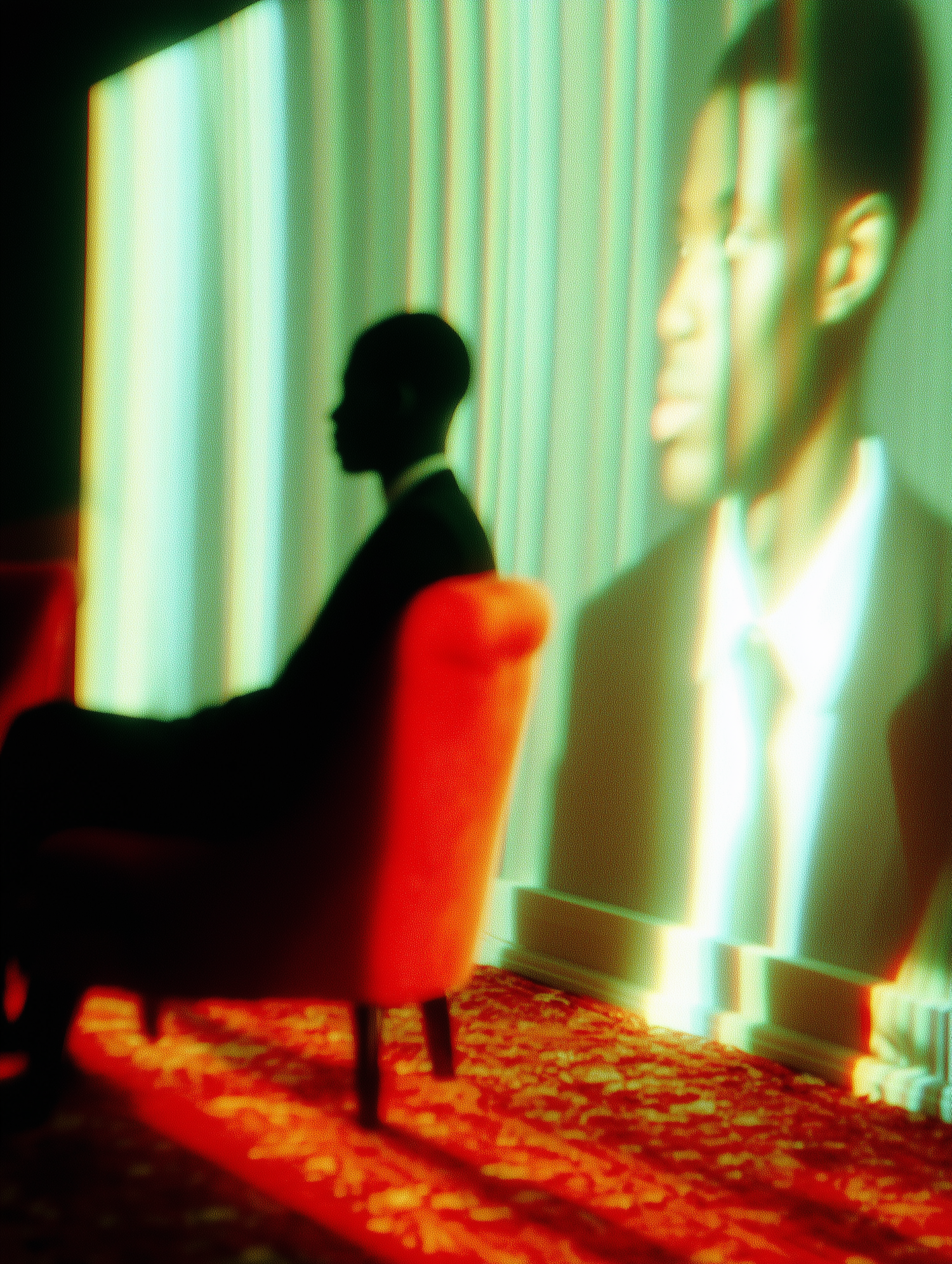 Silhouette of a man in a red chair with a projected profile behind him, creating a surreal and artistic atmosphere.