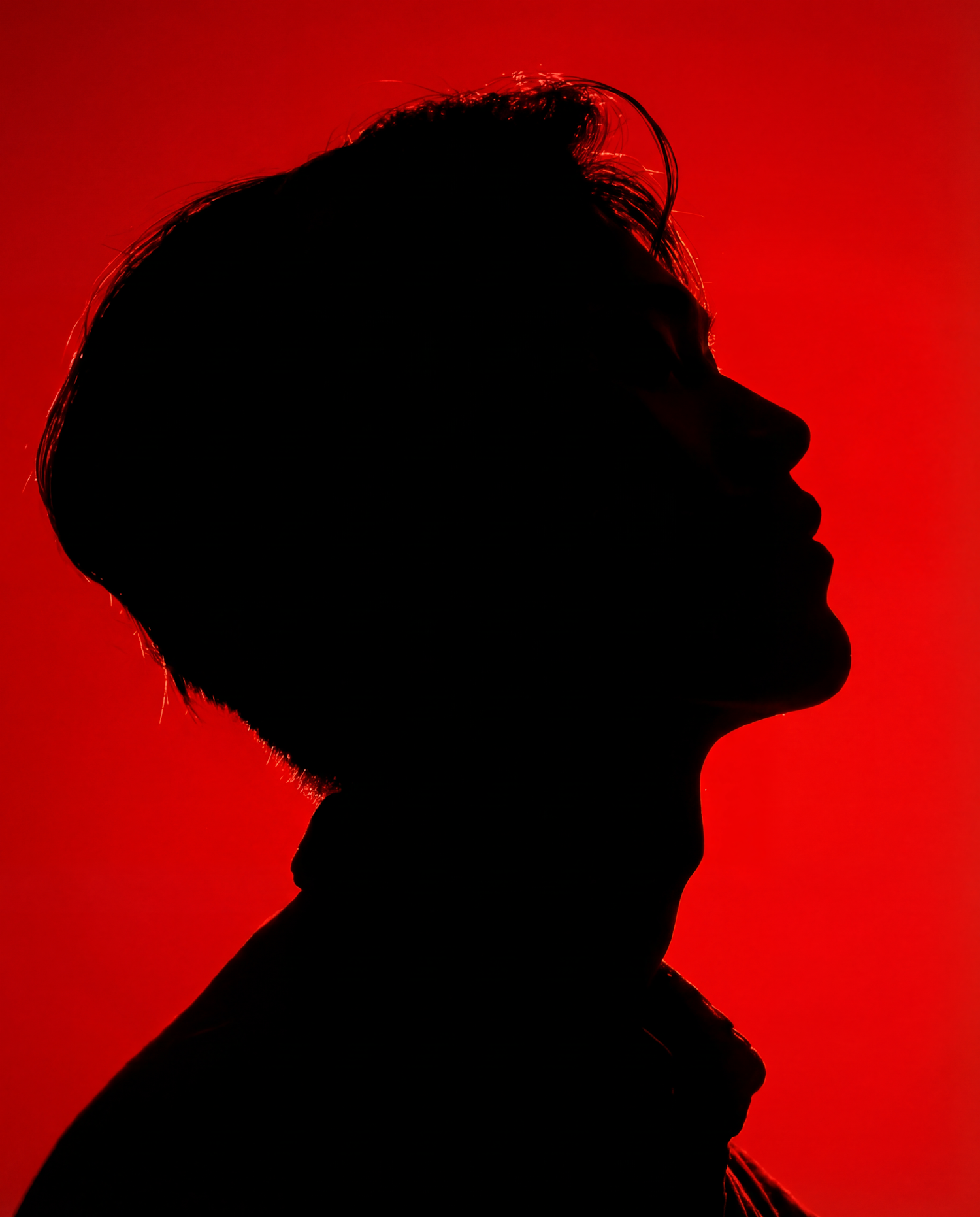 Silhouette of a person in profile against a vivid red background, creating a striking and dramatic visual contrast.