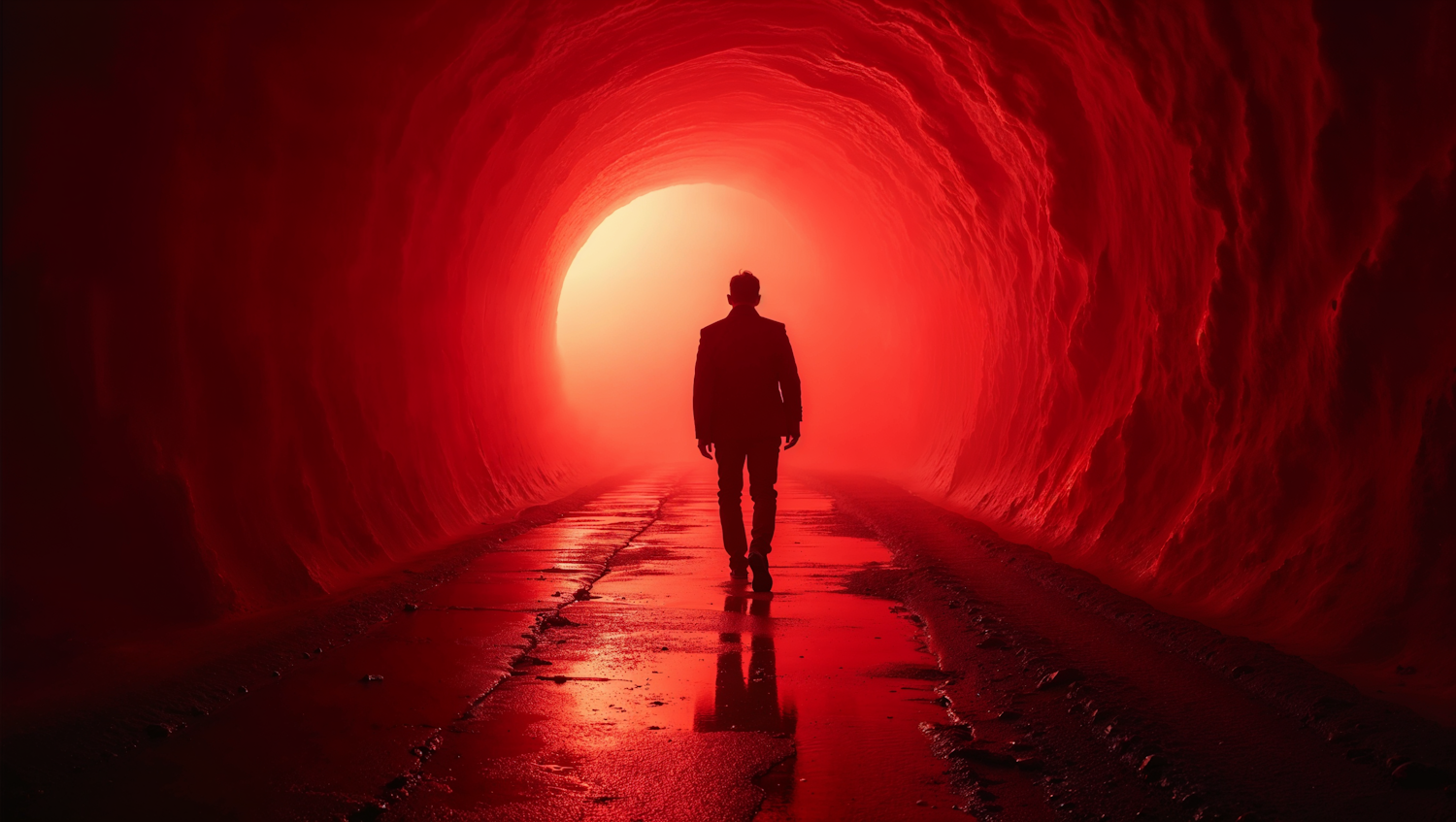 Silhouette in a red-lit tunnel creates a dramatic and mysterious atmosphere, with reflective surfaces enhancing the surreal scene.