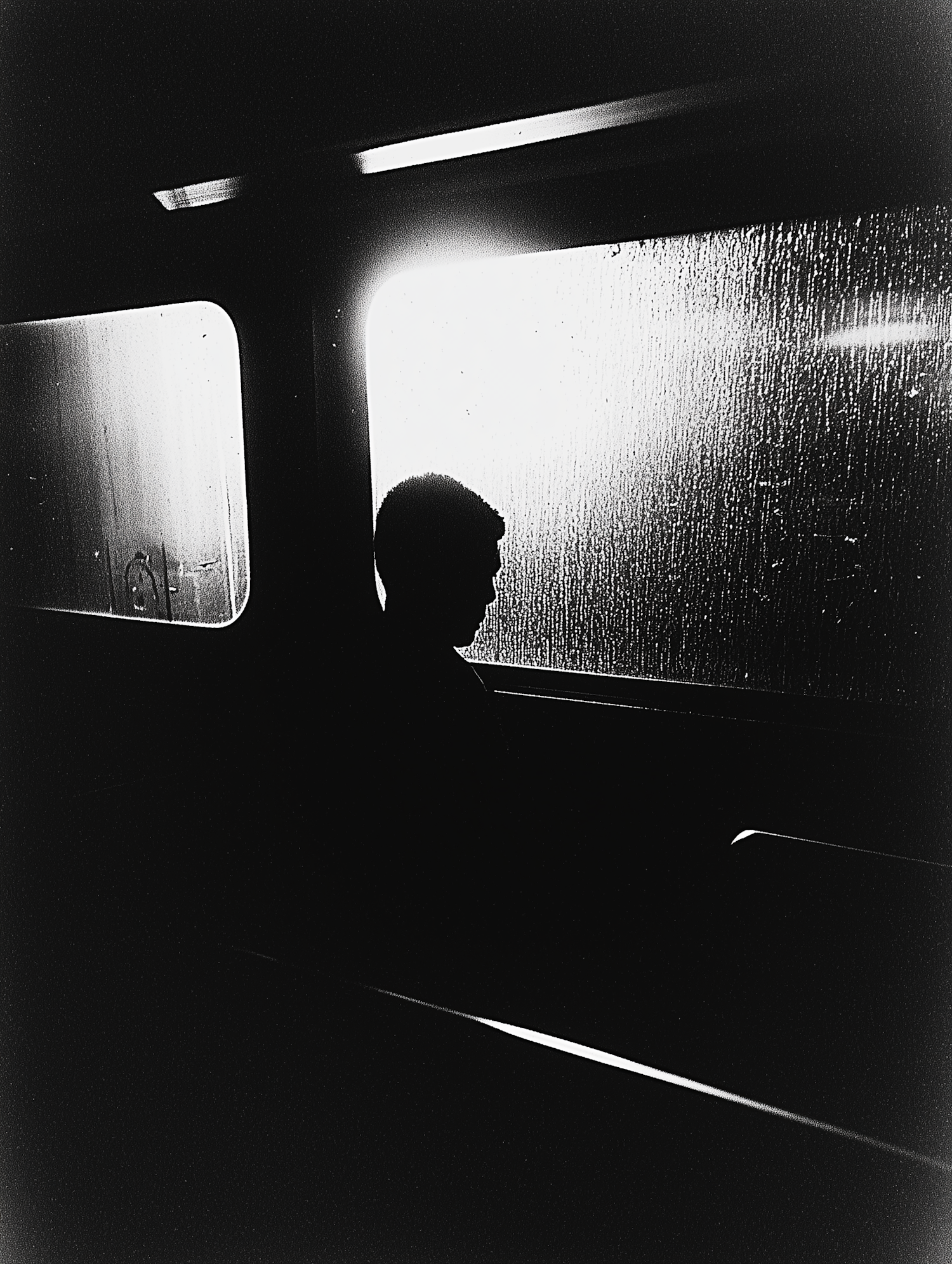 Silhouette of a person in a dimly lit train, backlit by a bright window with raindrops, creating a moody and dramatic scene.