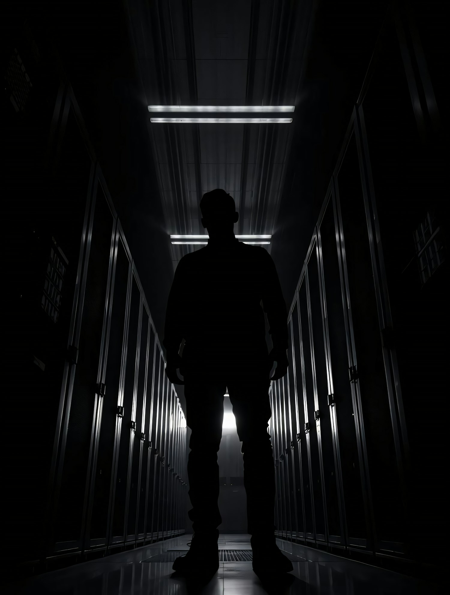 A silhouette of a person in a dimly lit server room, surrounded by rows of racks, creating a mysterious and high-tech atmosphere.