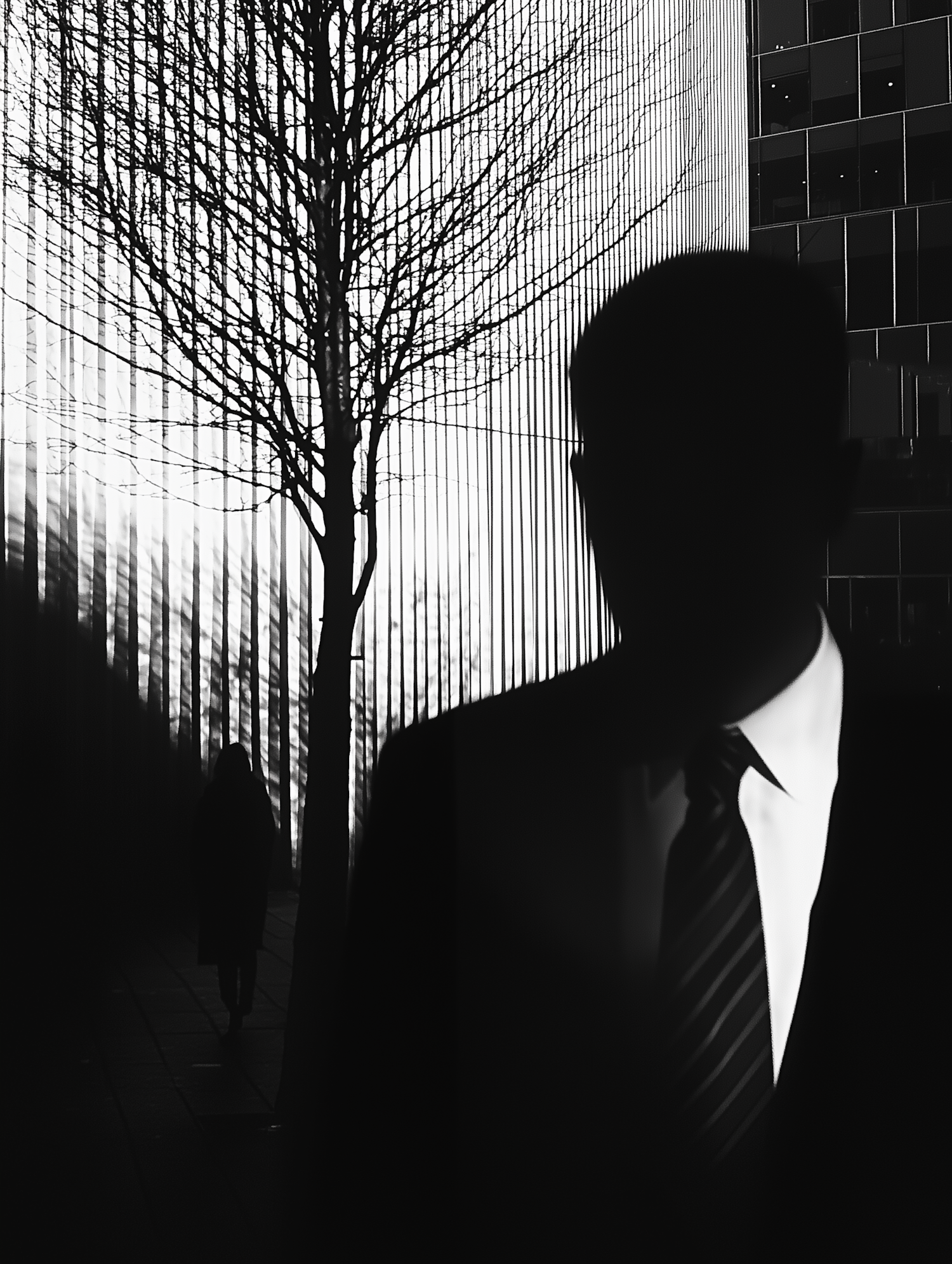 Dramatic black and white silhouette of a man in a suit with a tree and building in the background.